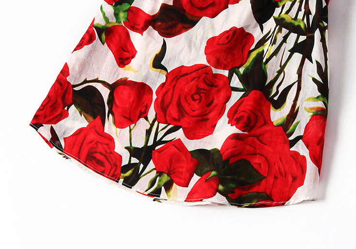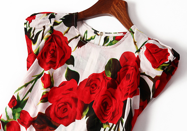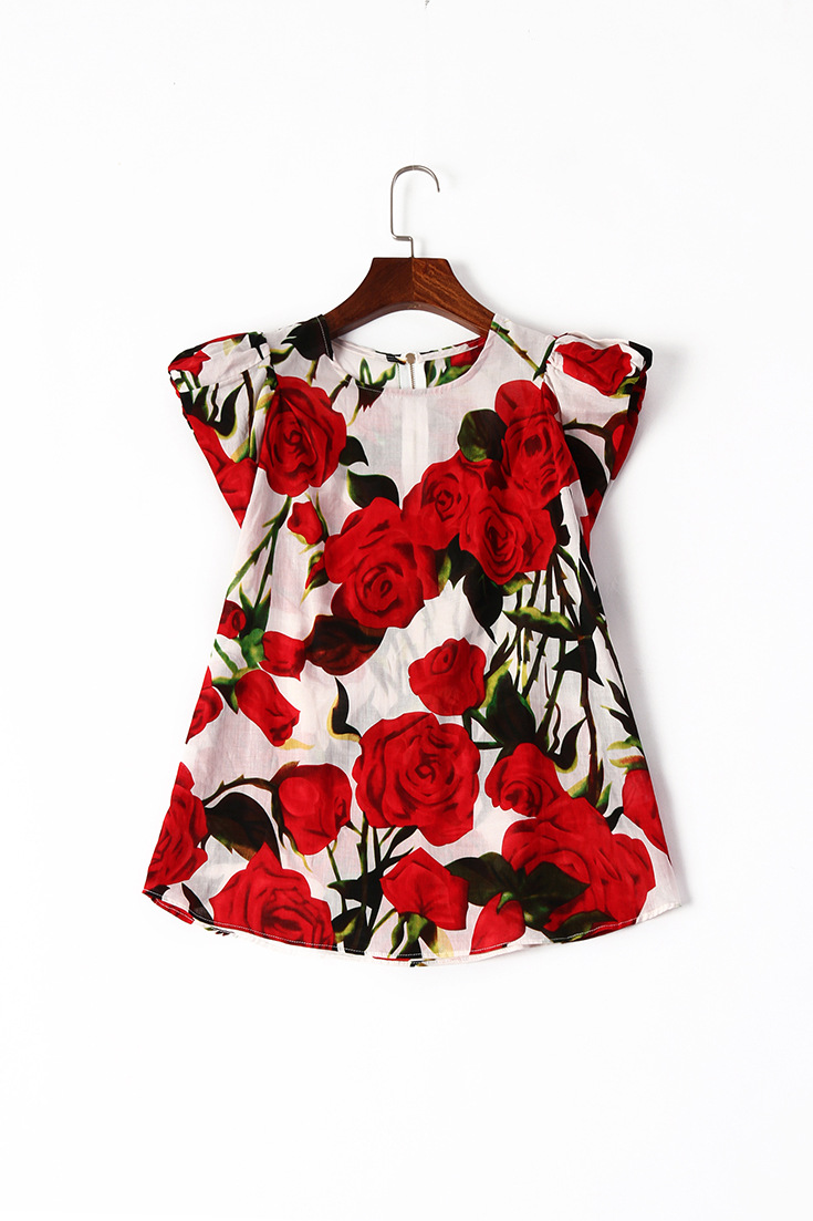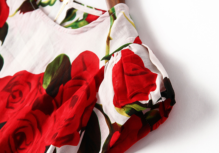 2015夏季女装新款 欧美高端圆领包肩袖玫瑰花亚麻女T恤印花小上衣