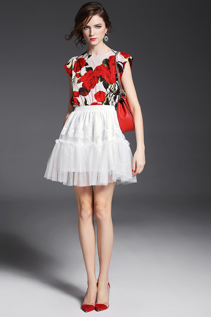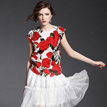 > 2015夏季女装新款 欧美高端圆领包肩袖玫瑰花亚麻女T恤印花小上衣