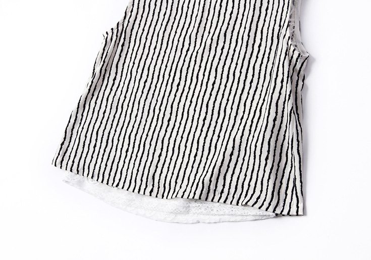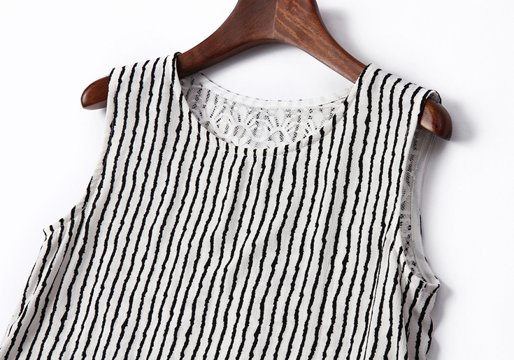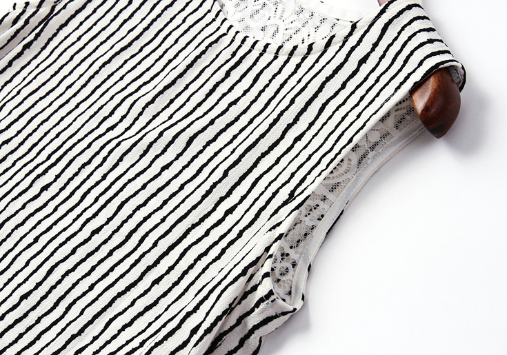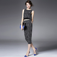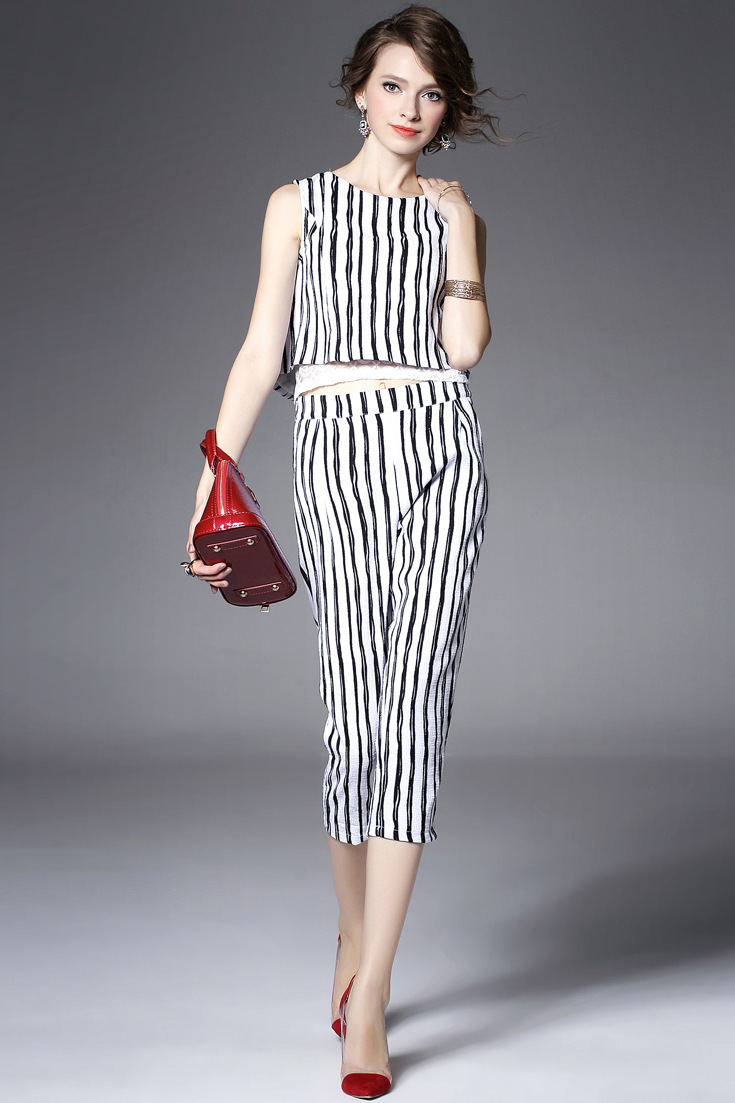 2015夏 无袖圆领蕾丝拼接假两件短上衣+弹力竖条纹显瘦七分裤套装
