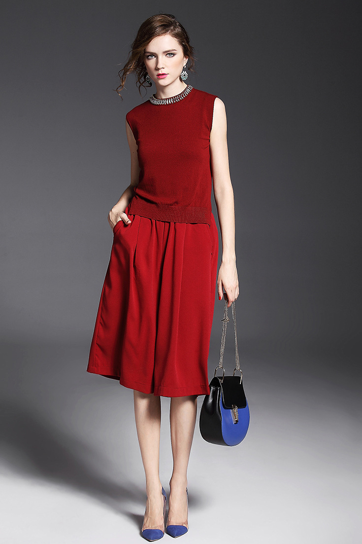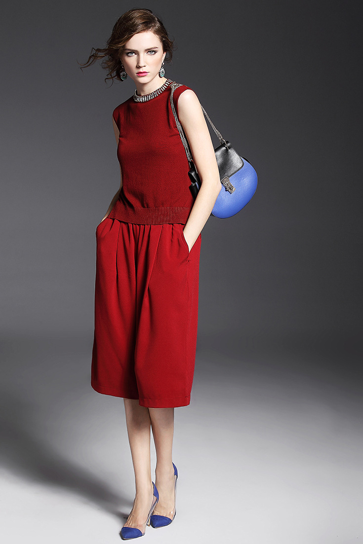 2015夏季新款 立领钉珠弹力修身纯色薄款毛衣+宽松哈伦七分裤套装
