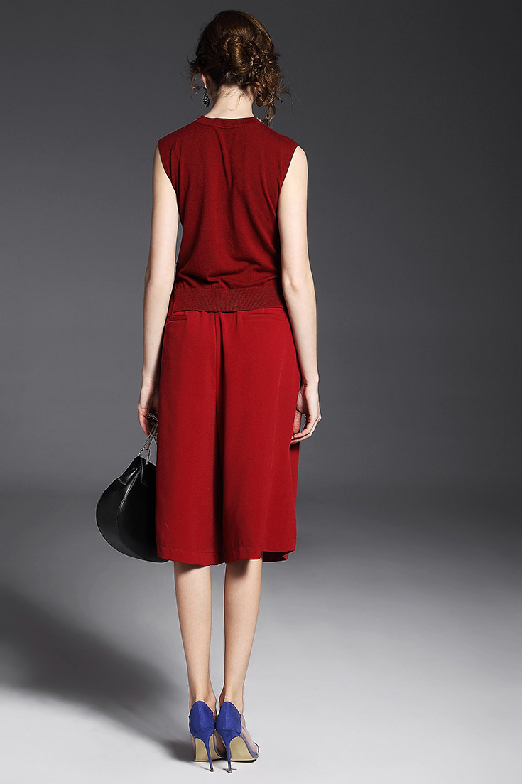 2015夏 欧美时尚不规则后背开叉真丝拼接条纹上衣+阔腿短裤套装