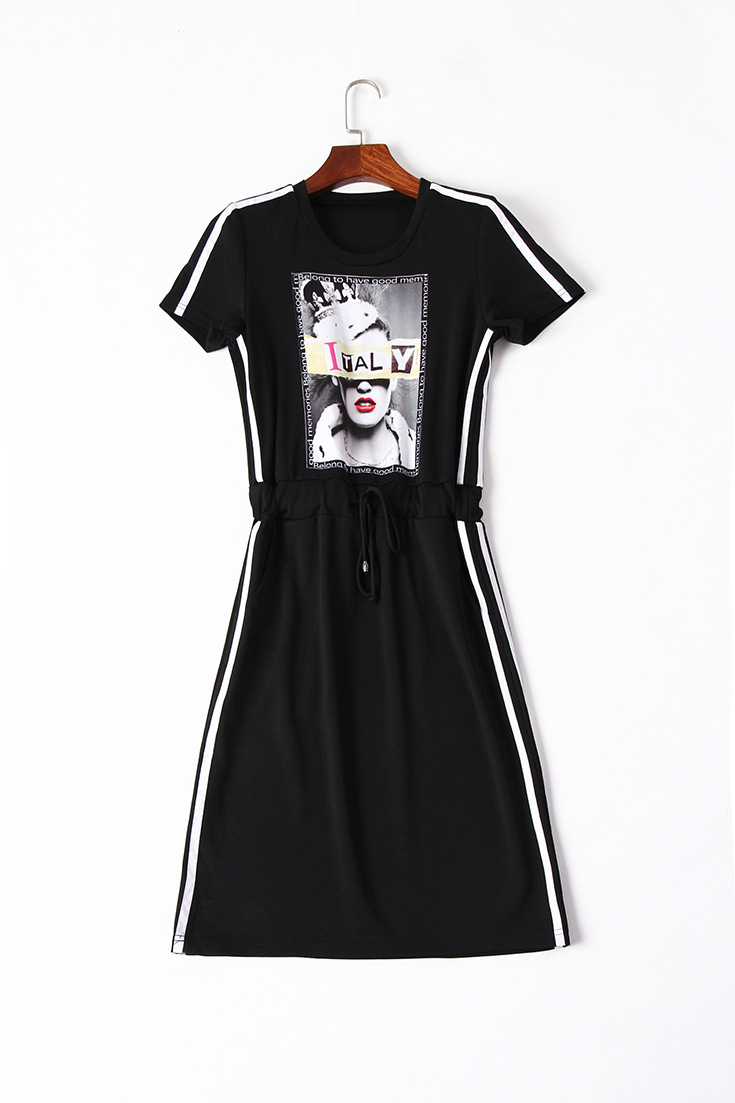 > 2015品质女装 欧美大牌印花重工织带拼接系带弹力修身连衣裙