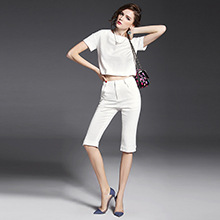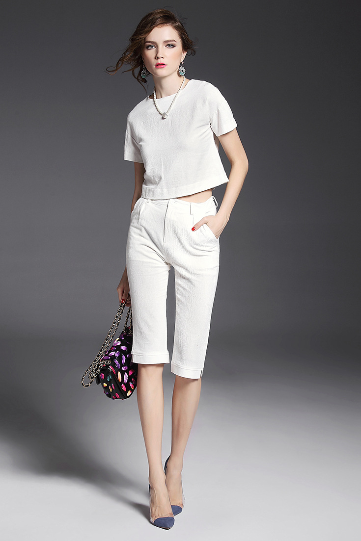 > 2015夏季女装新款 圆领短袖时尚套头短上衣+纯色修身七分裤套装