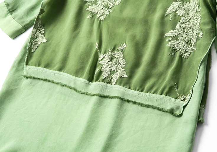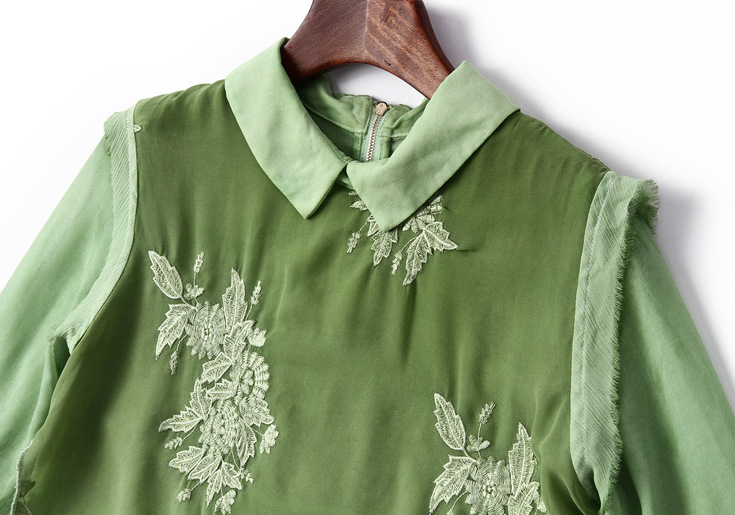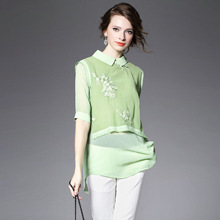 2015夏 欧美大牌翻领中袖时尚纯色重工绣花不规则拼接修身衬衣女
