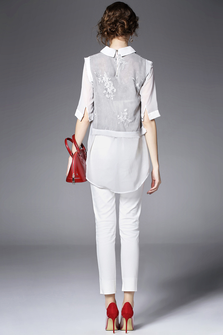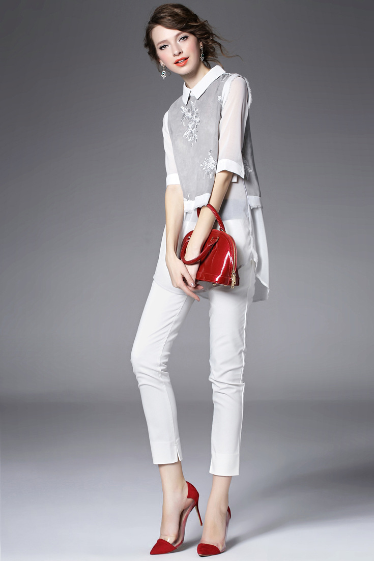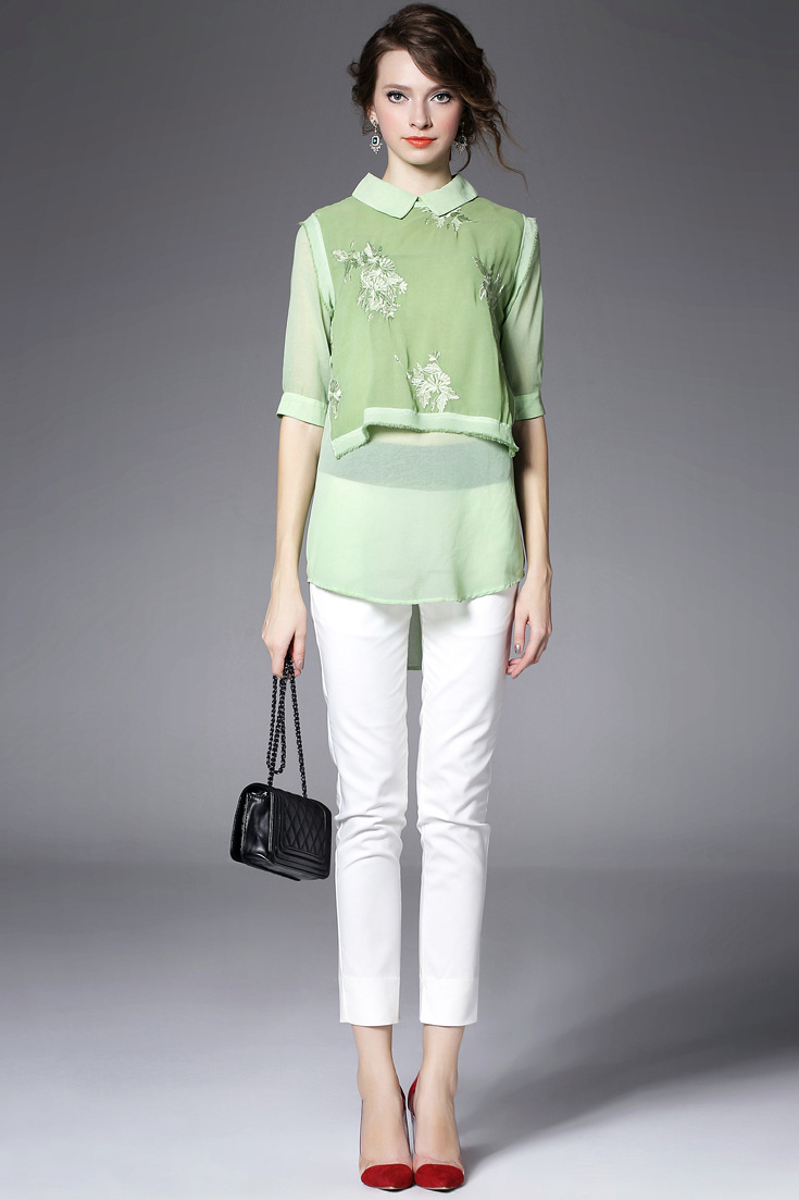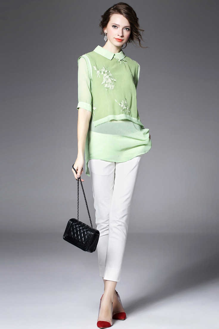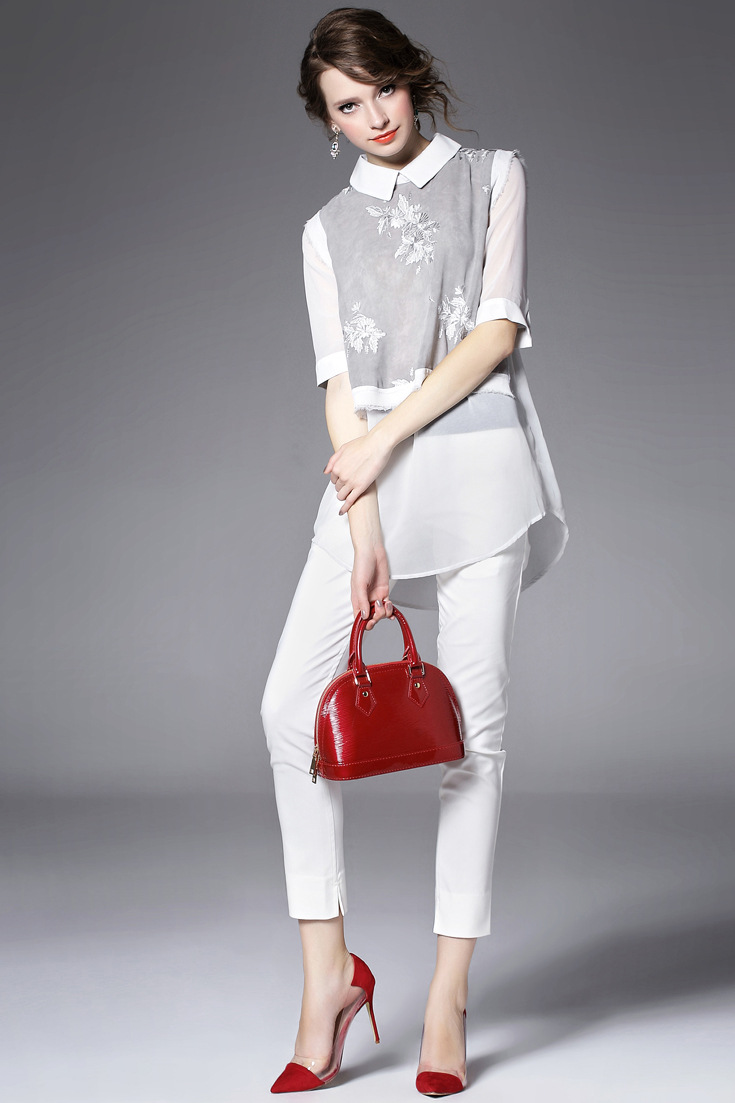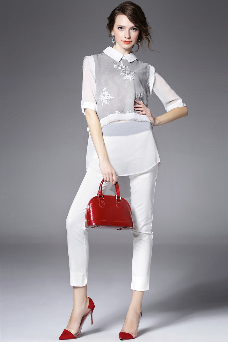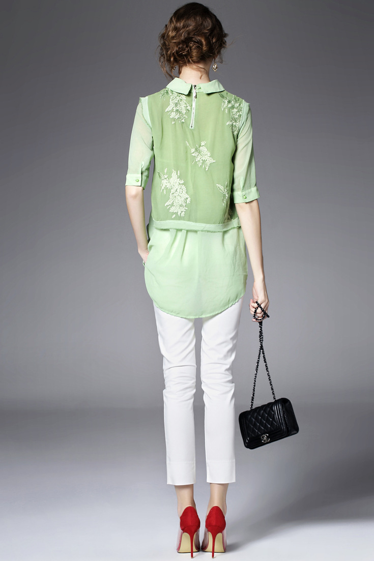 > 2015夏 欧美大牌翻领中袖时尚纯色重工绣花不规则拼接修身衬衣女