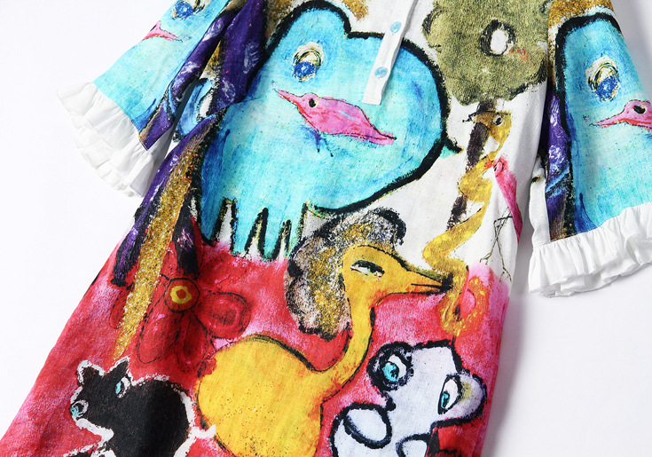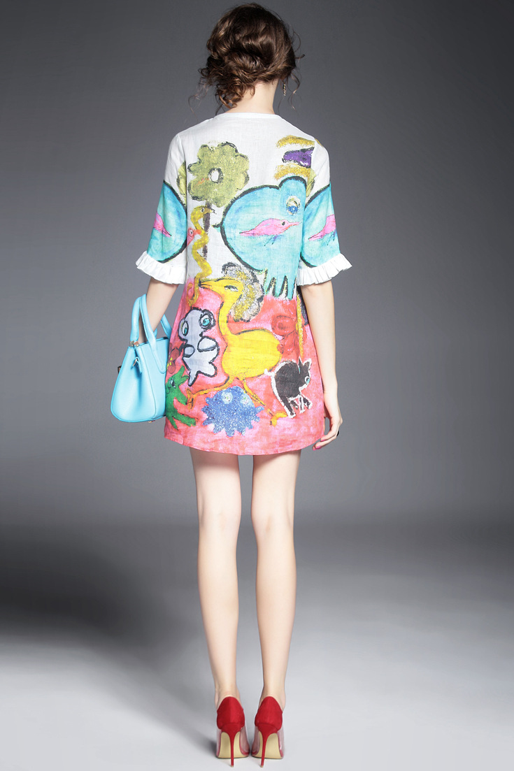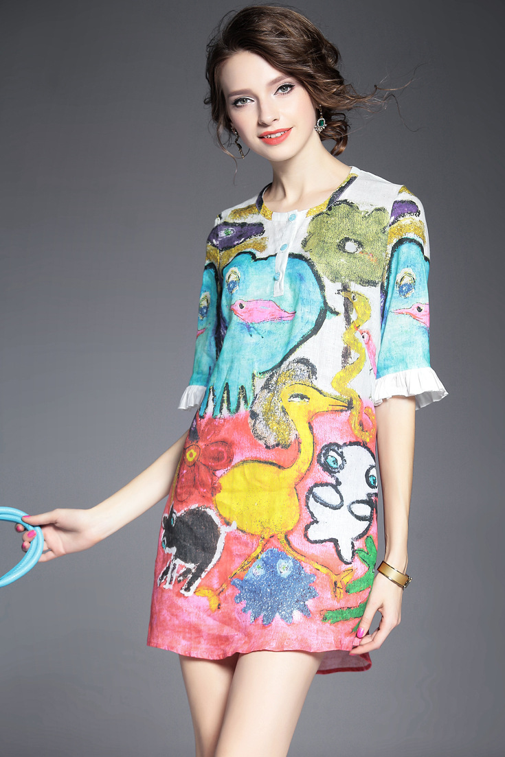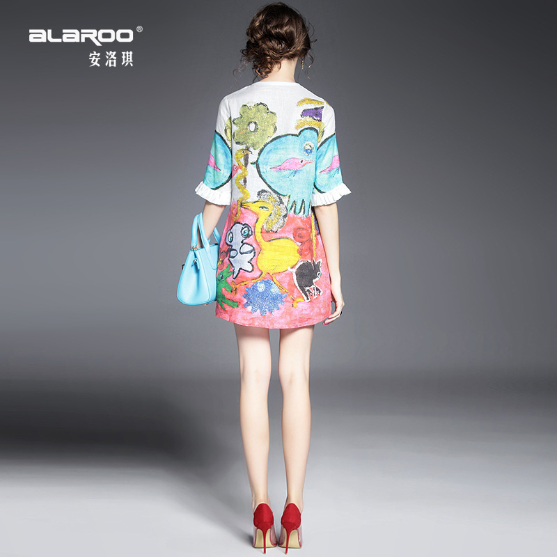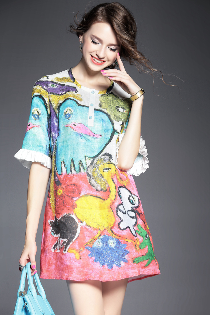> 2015夏季女装 欧美圆领时尚袖口荷叶边棉麻童趣印花连衣裙