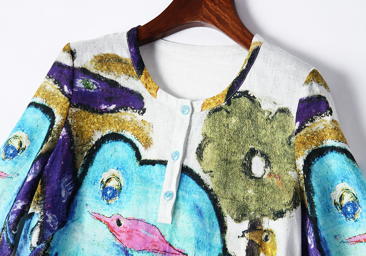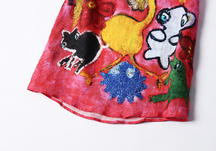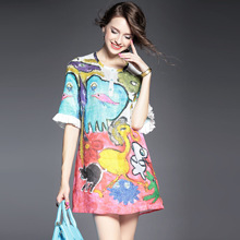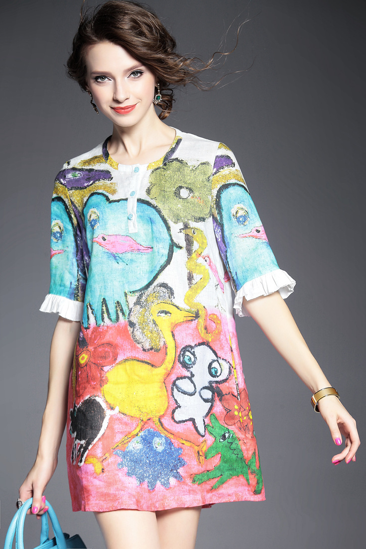 2015夏季女装 欧美圆领时尚袖口荷叶边棉麻童趣印花连衣裙