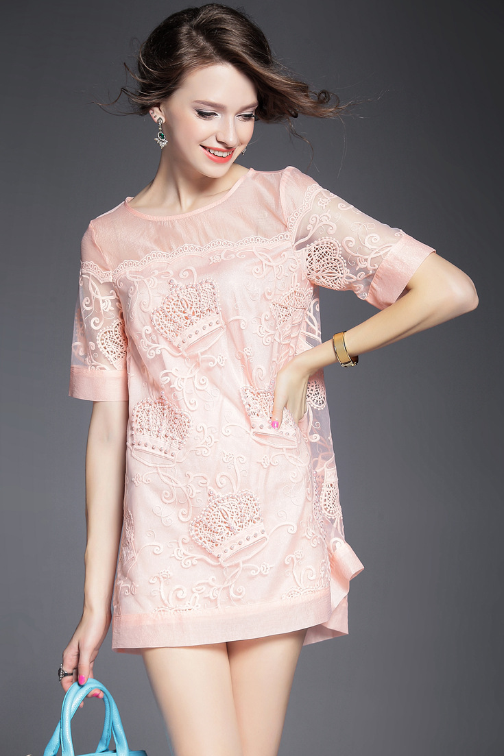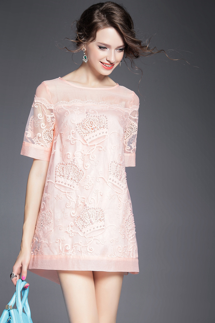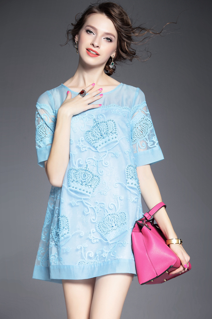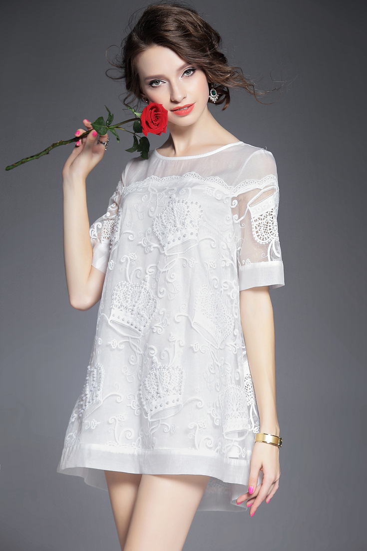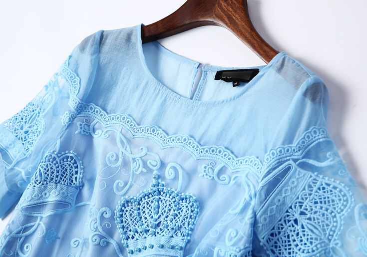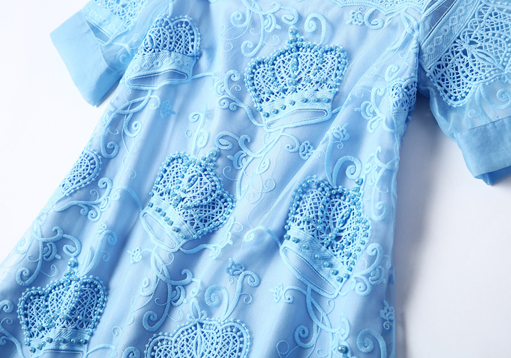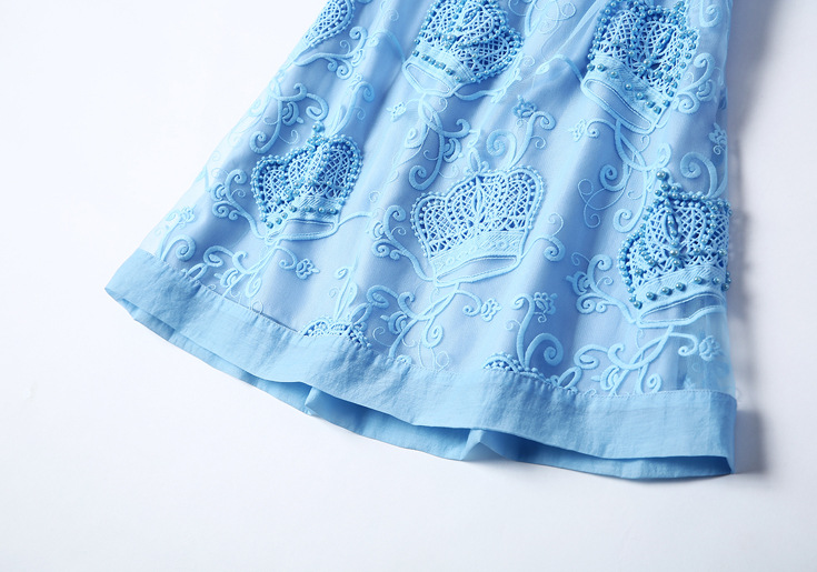 2015夏 重工奢华钉珠皇冠绣花后背开叉纯色连衣裙子