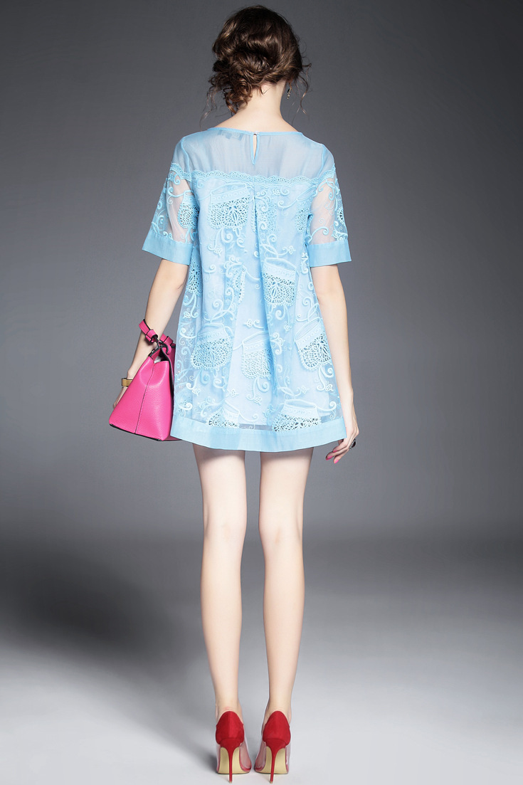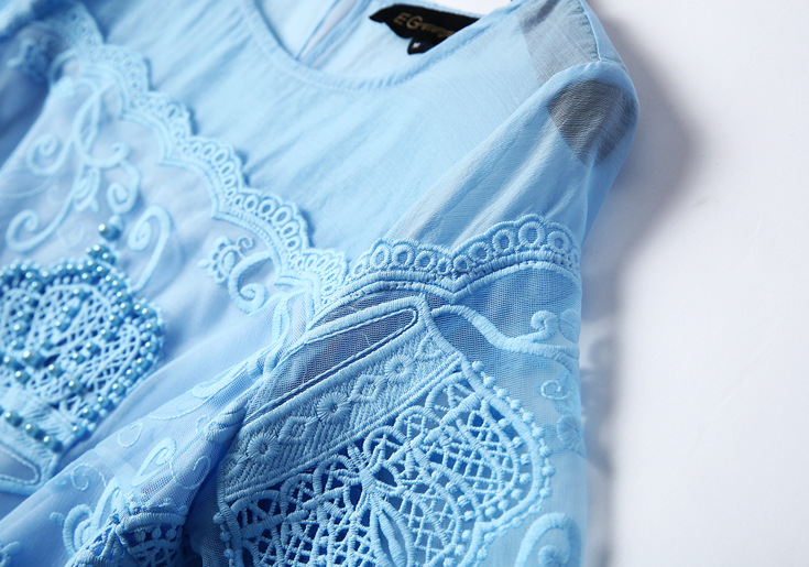 2015欧美风春季仙女裙气质新款刺绣网纱连衣裙七分袖大摆裙