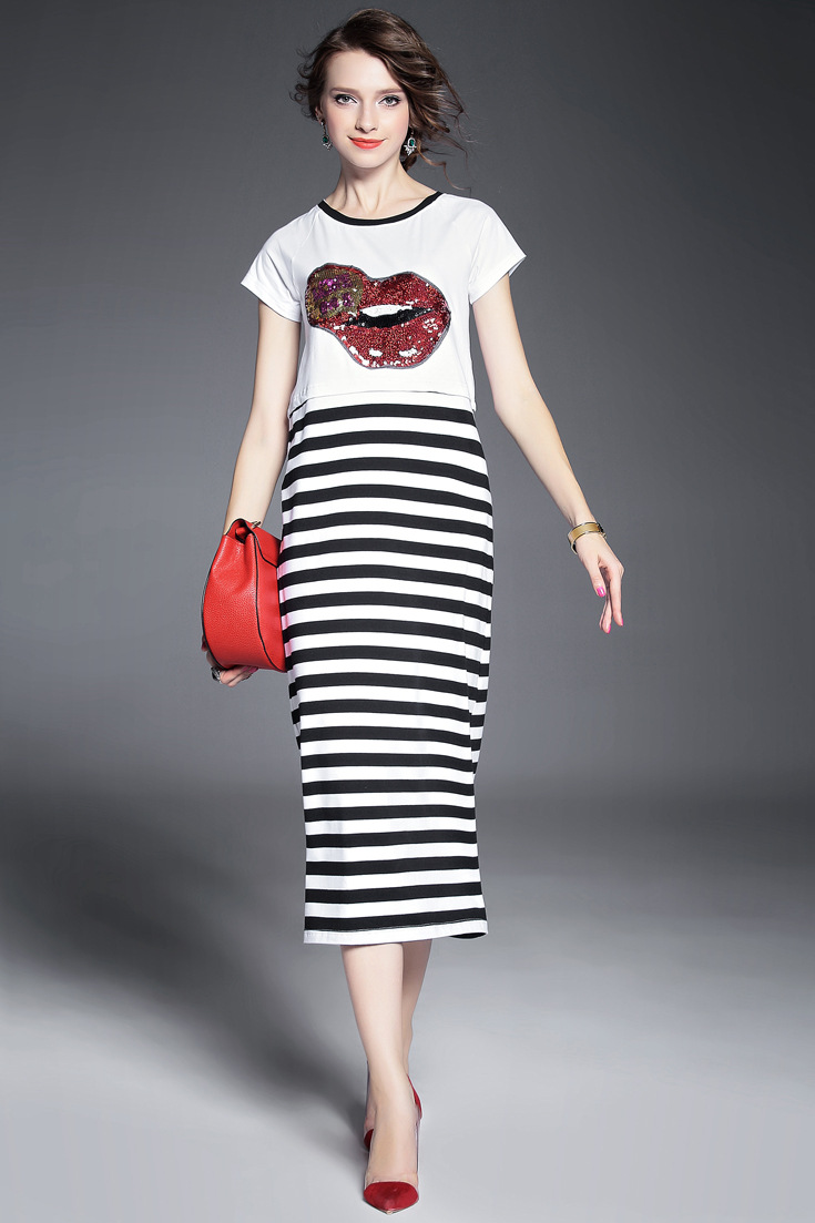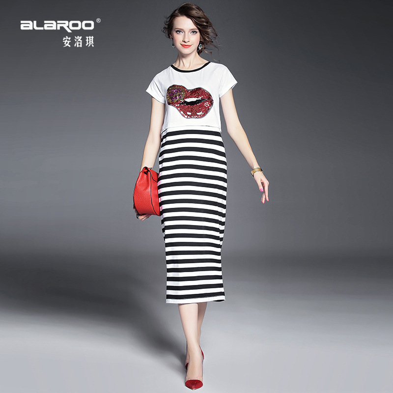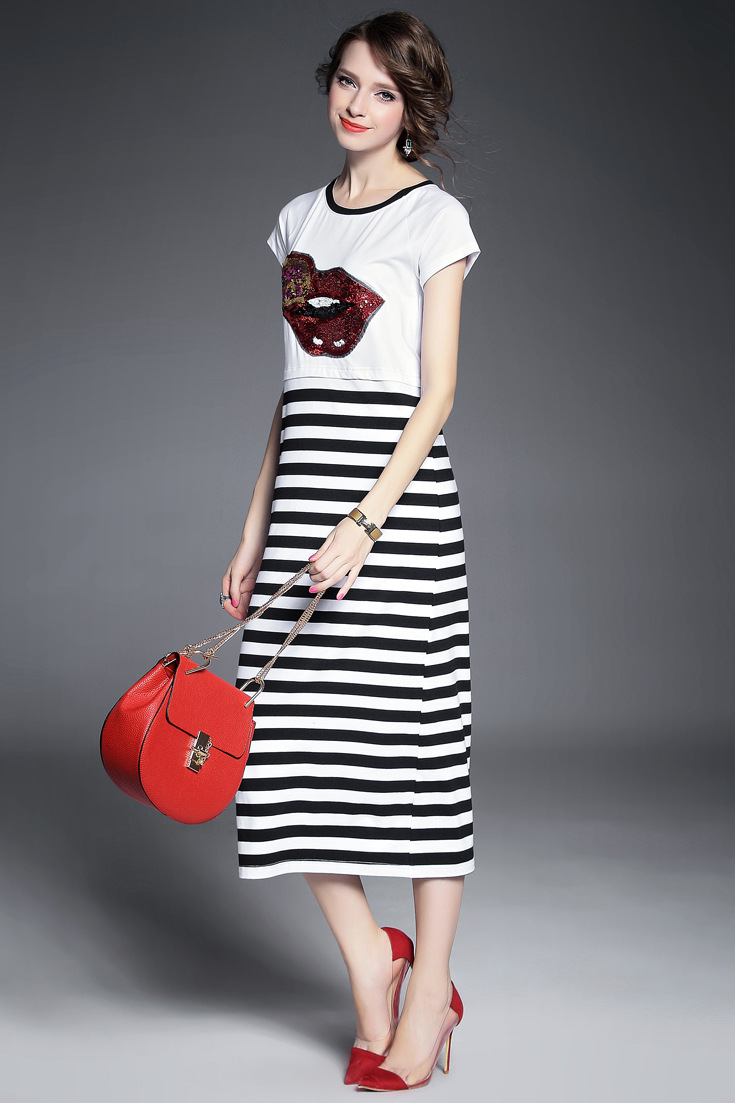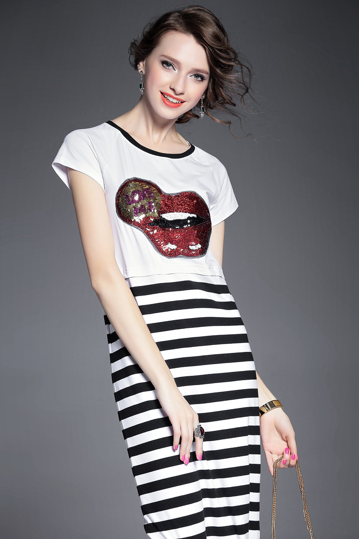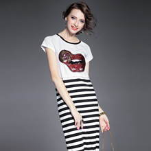 2015夏季新款女装 欧美圆领条纹嘴唇亮片绣花弹力修身中长连衣裙