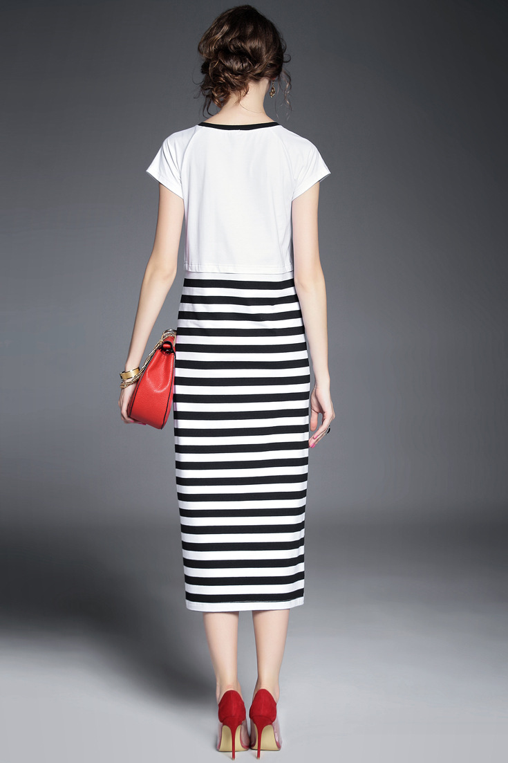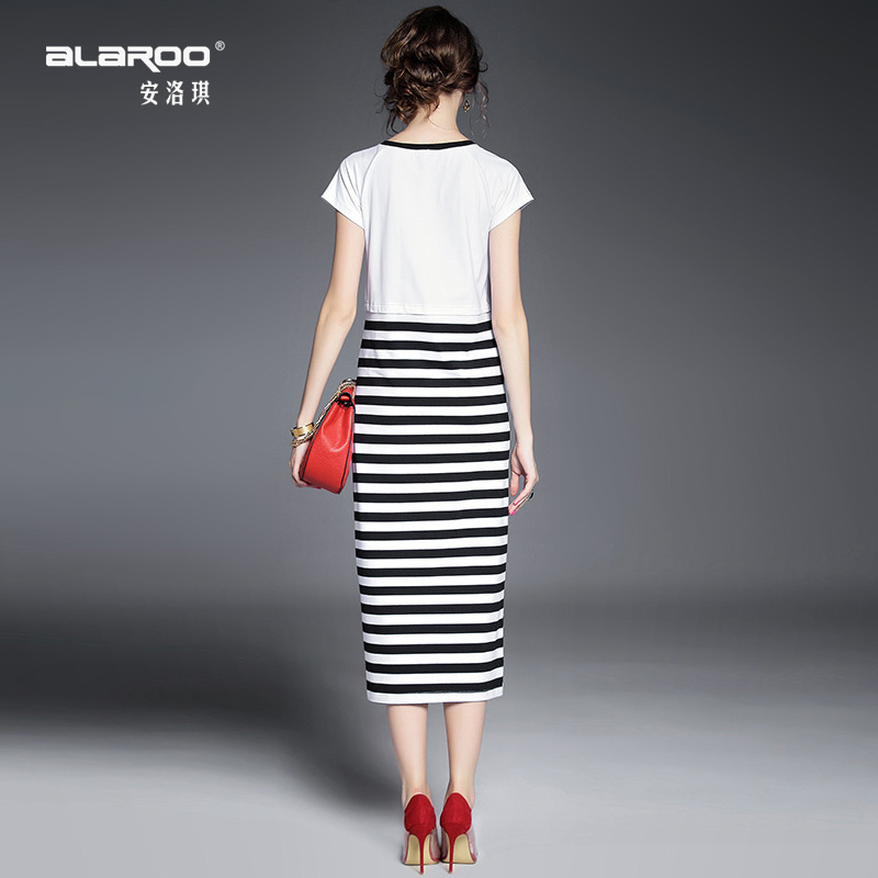 > 2015夏季新款女装 欧美圆领条纹嘴唇亮片绣花弹力修身中长连衣裙