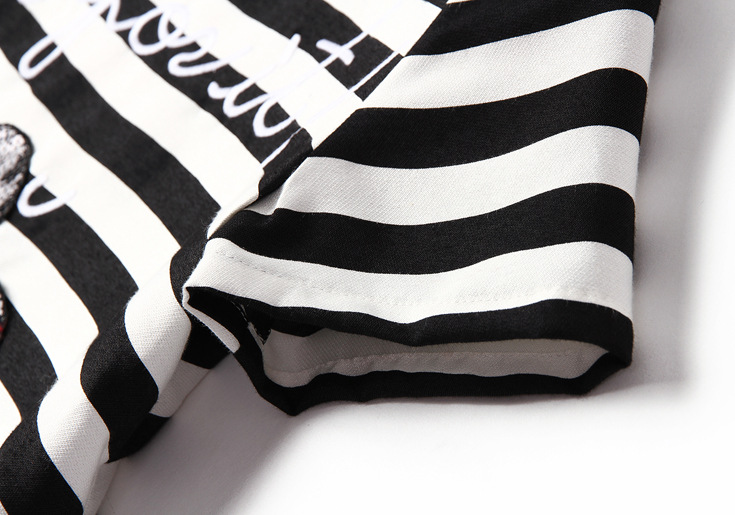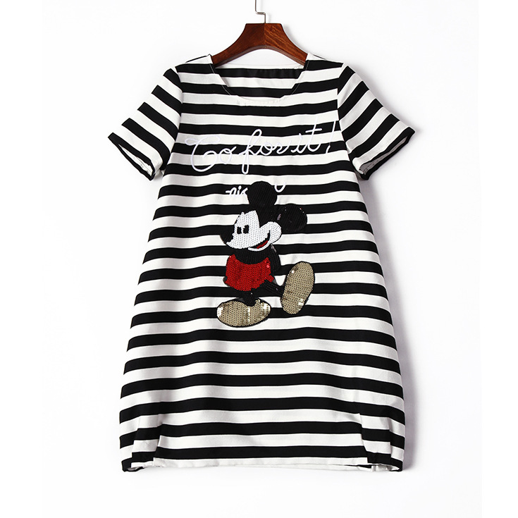 2015夏季女装新款 欧美大牌时尚圆领米奇亮片绣花条纹宽松连衣裙