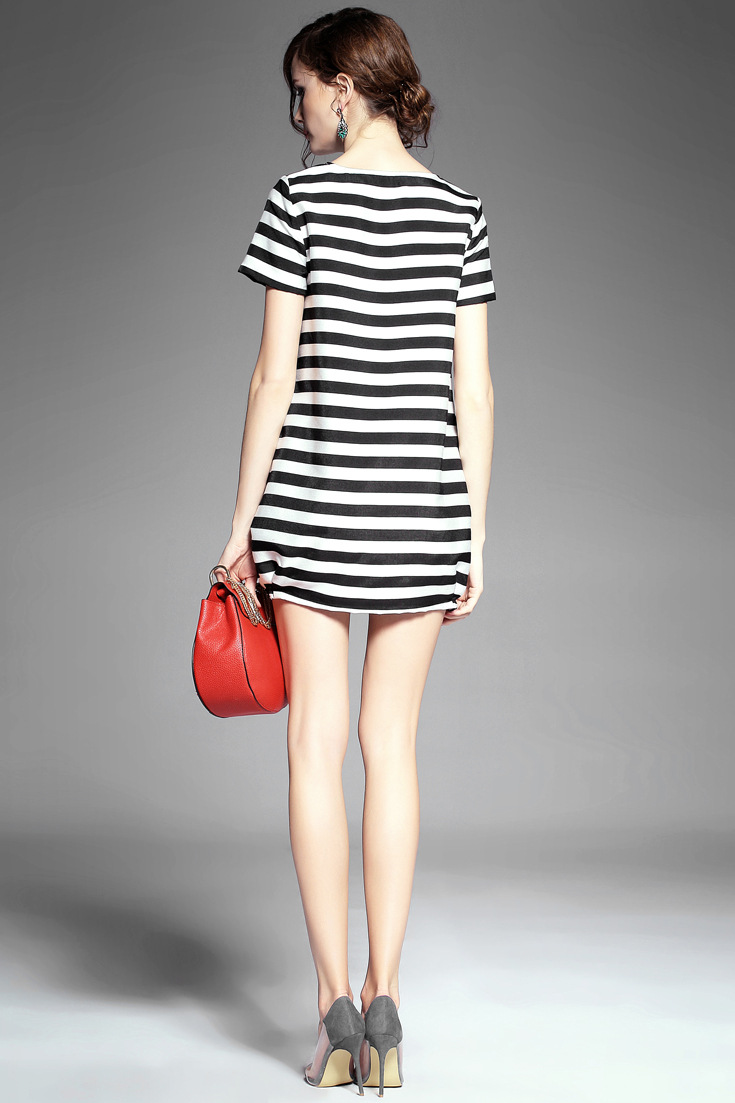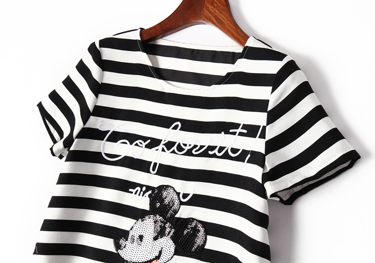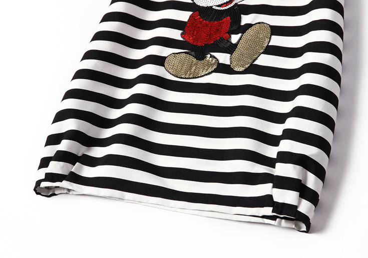 > 2015夏季女装新款 欧美大牌时尚圆领米奇亮片绣花条纹宽松连衣裙