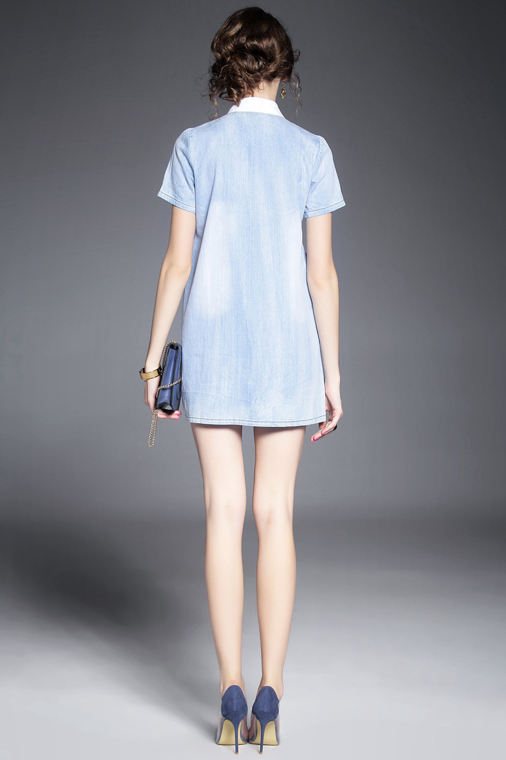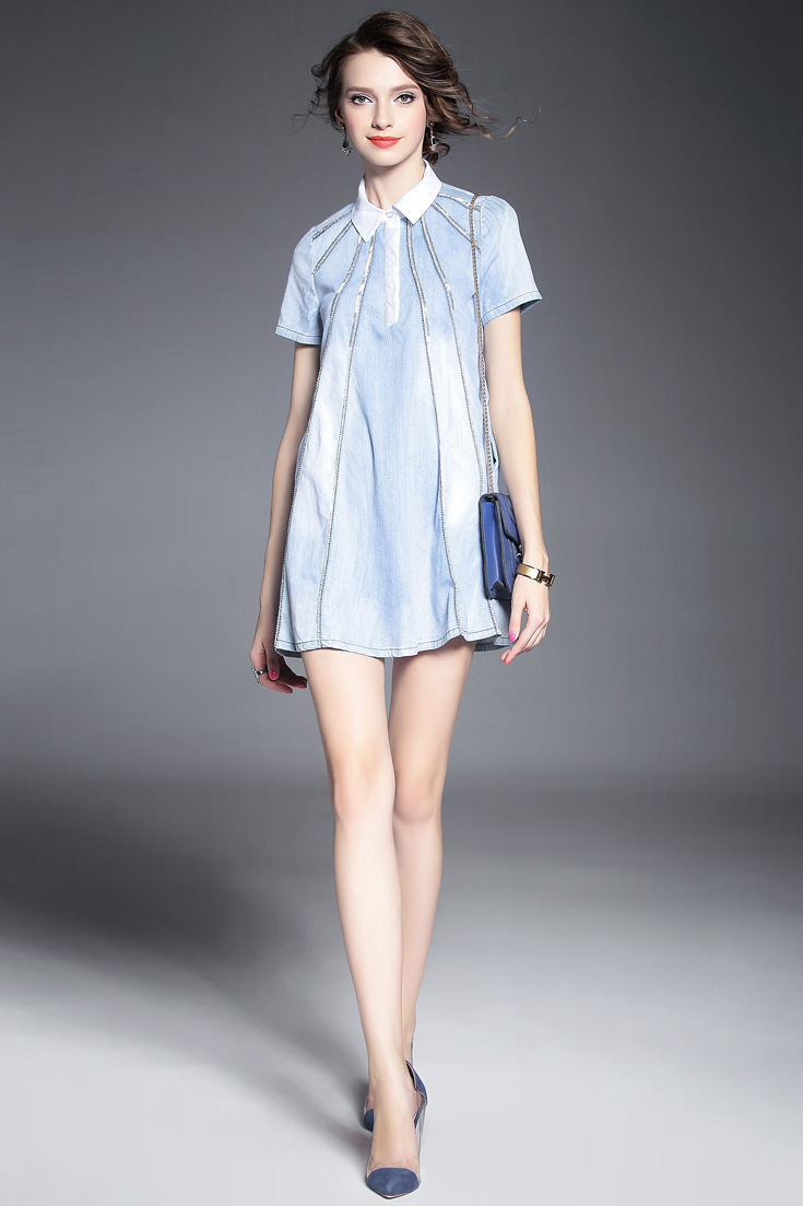 > 2015夏翻领重工钉钻拼接水洗白纯棉牛仔裙品质连衣裙