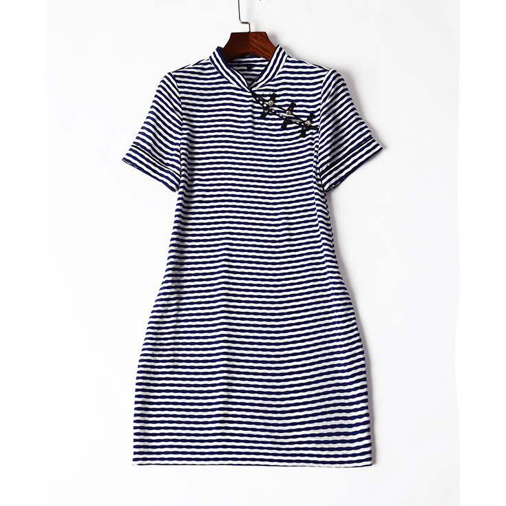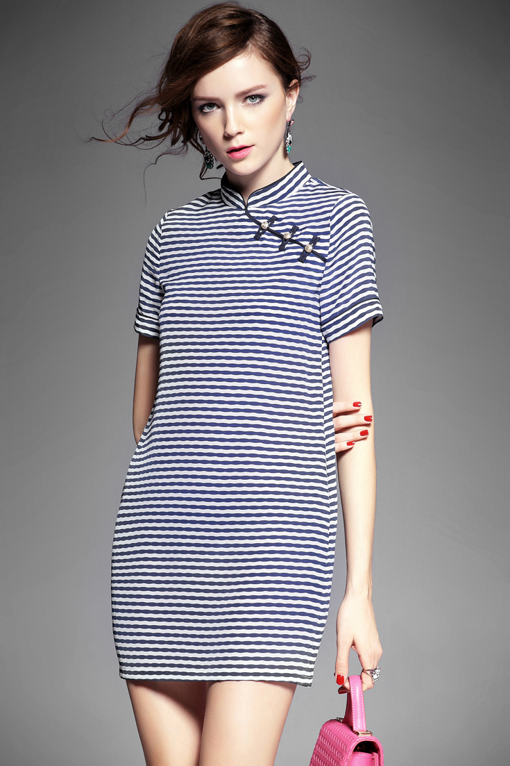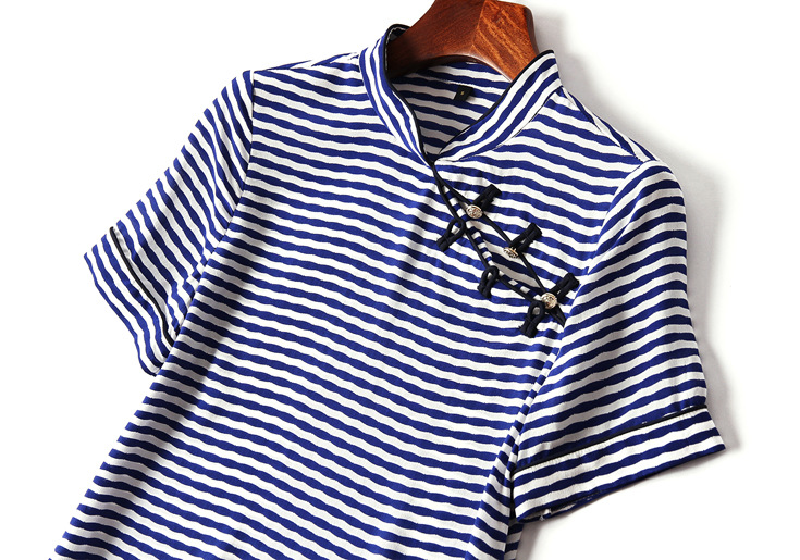 2015夏季女装新款 复古中国风立领斜门襟盘扣条纹修身真丝旗袍