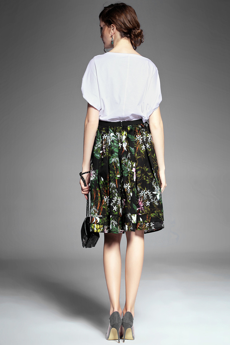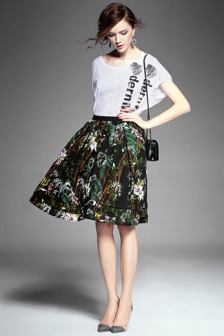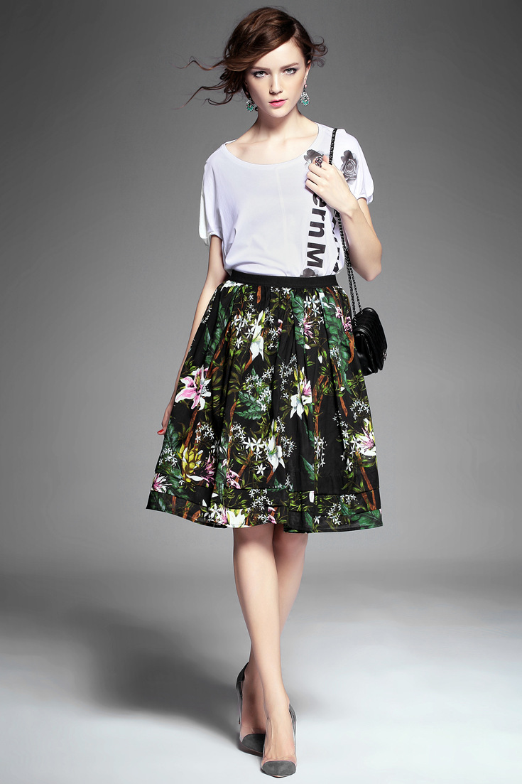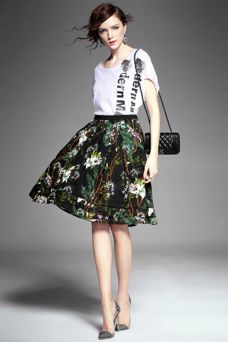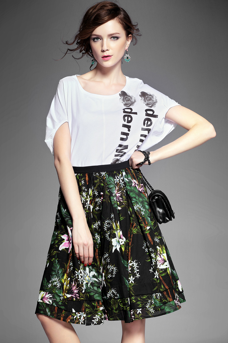 2015夏季新款女装 欧美高端圆领印花蕾丝波浪边拼接长款女T恤