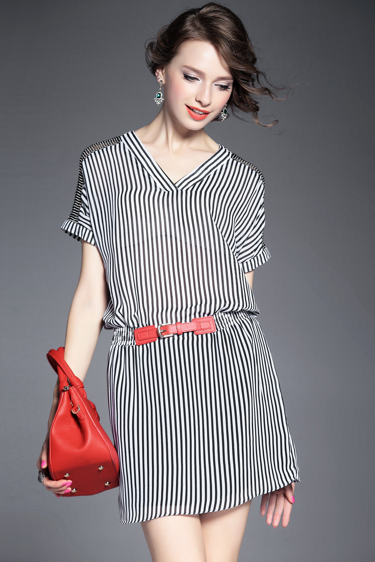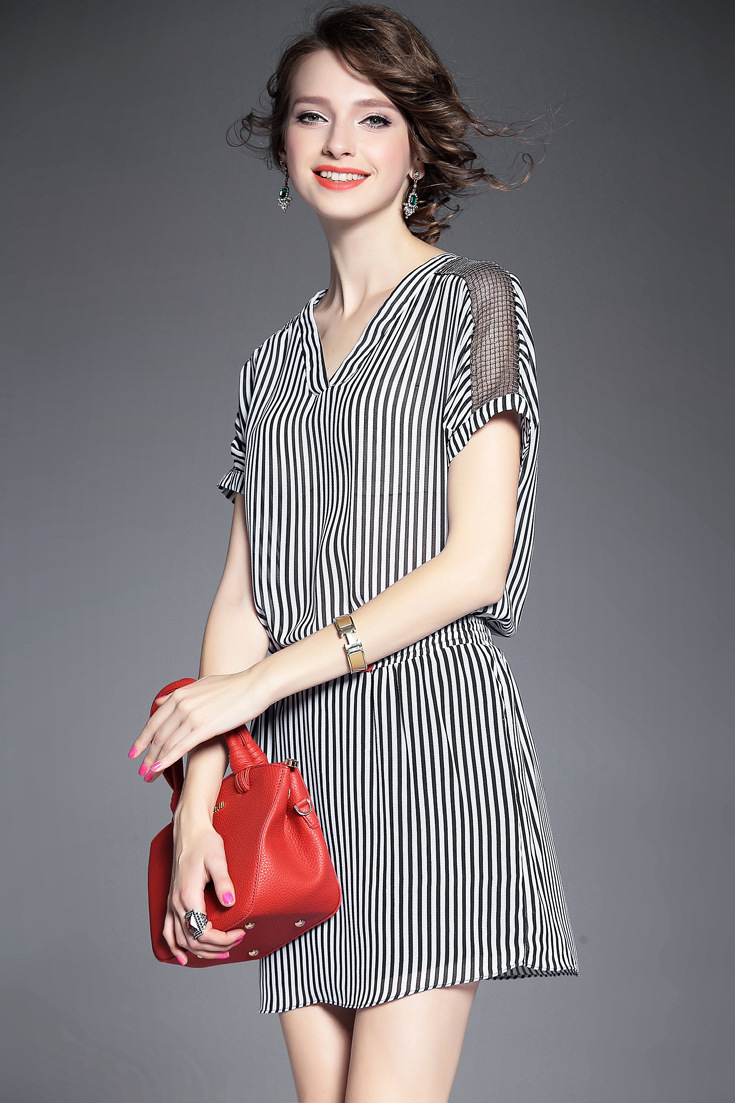 > 2015夏季女装 时尚v领网纱串珠拼接弹力收腰条纹修身连衣裙显瘦