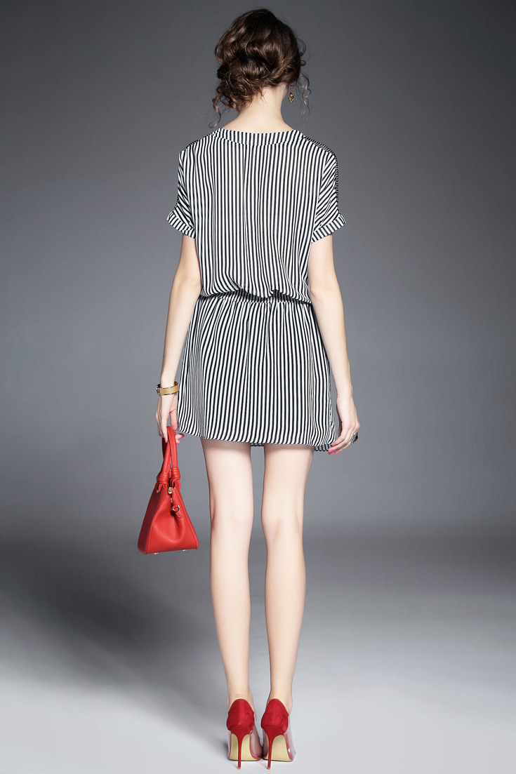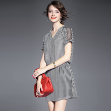2015夏季女装 时尚v领网纱串珠拼接弹力收腰条纹修身连衣裙显瘦