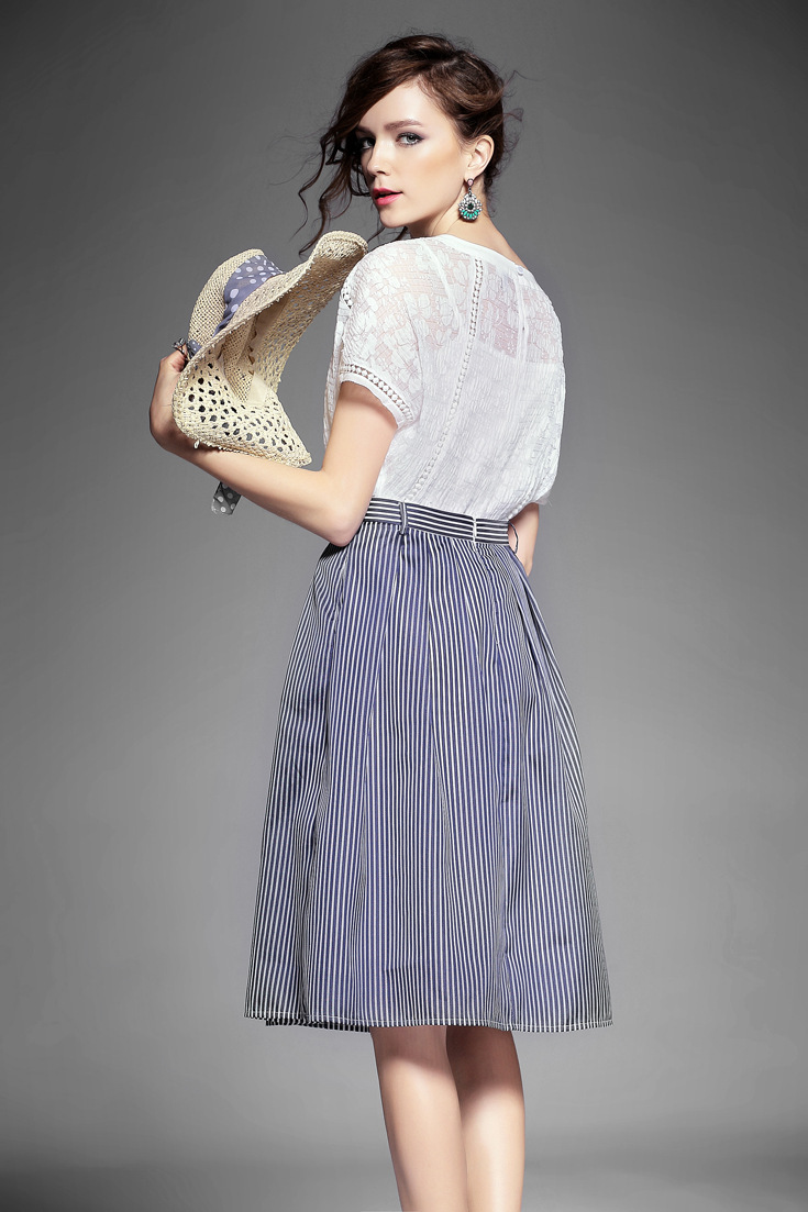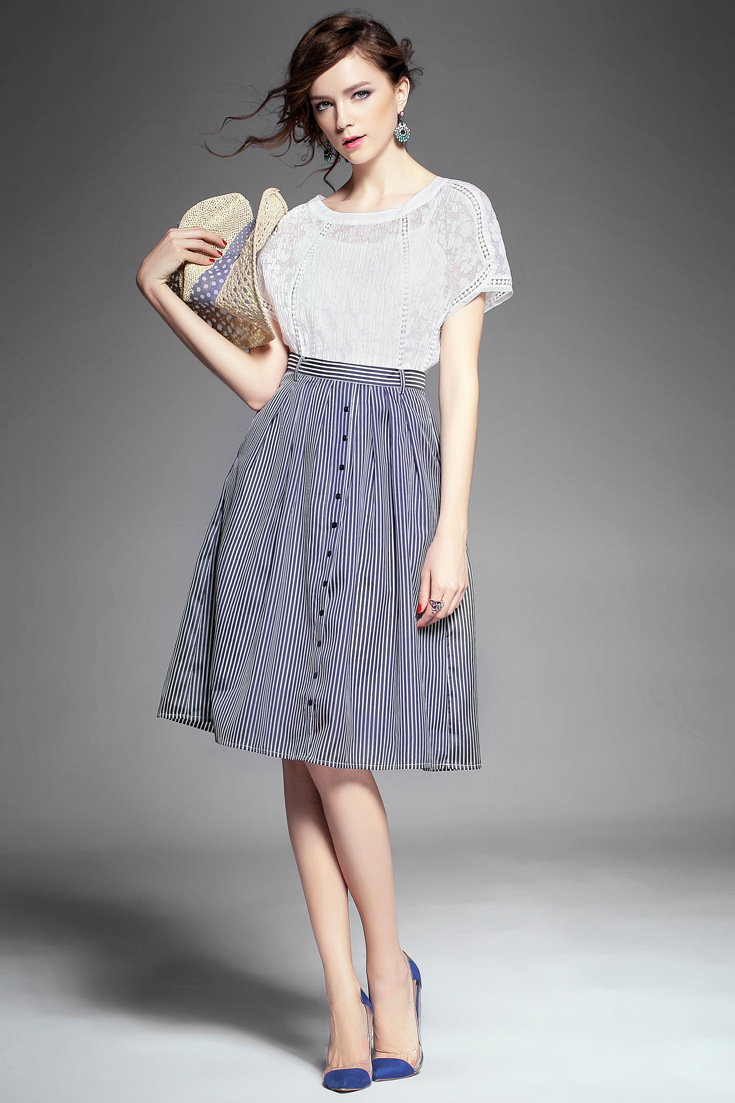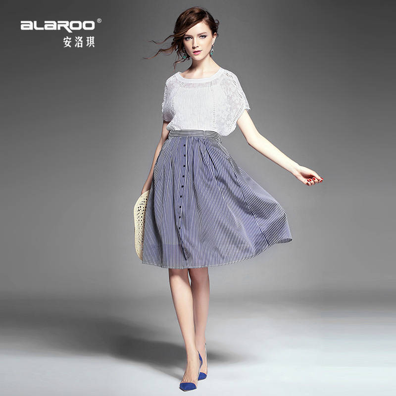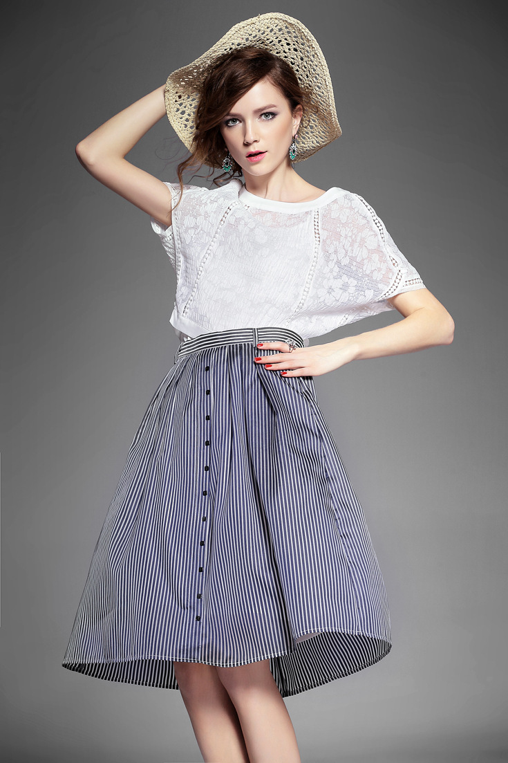 2015夏季女装 欧美大牌袖口蕾丝拼贴短袖T恤+印花半裙两件套