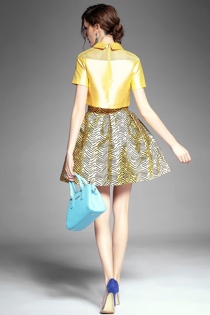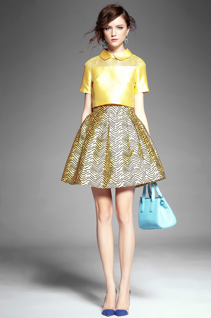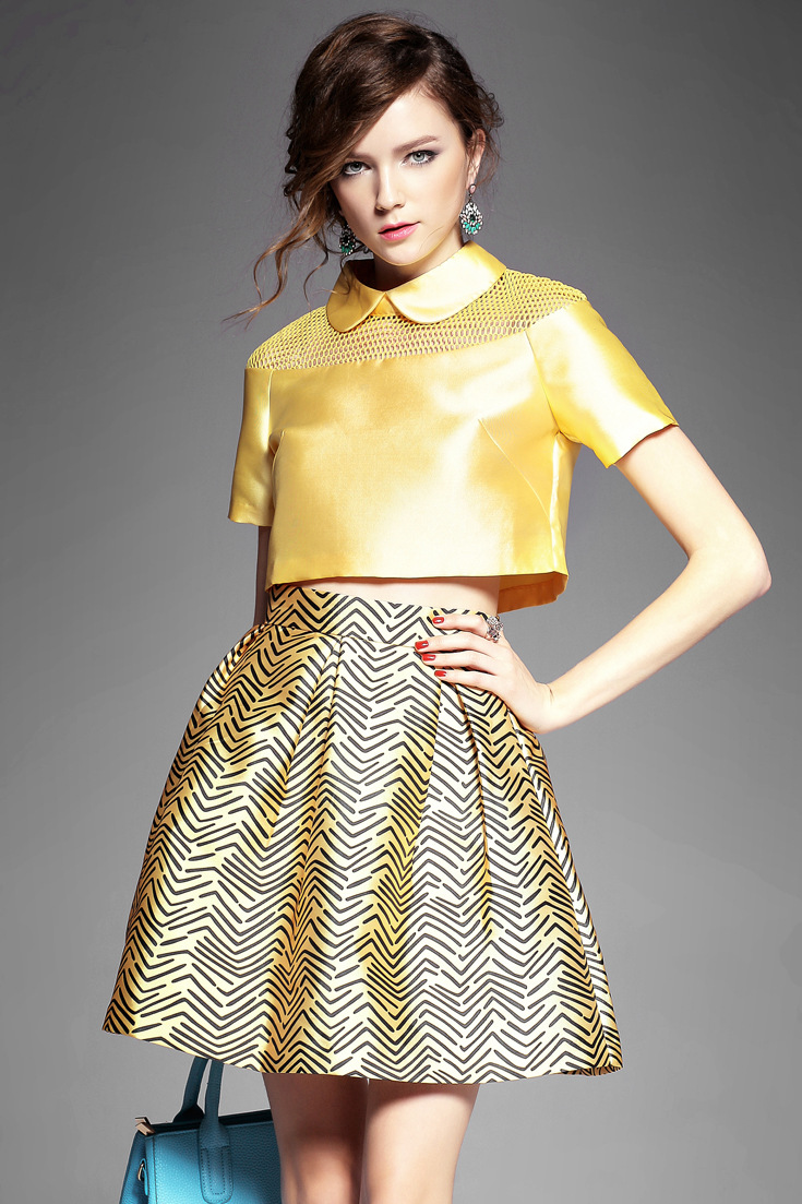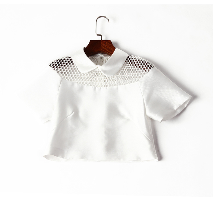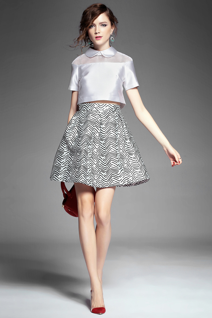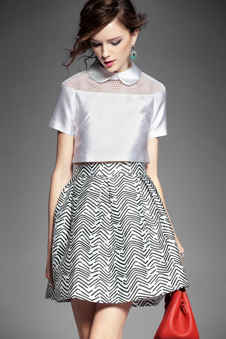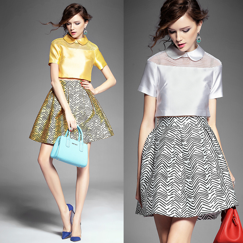 > 2015夏季新款 甜美娃娃领网眼镂空短上衣+斜纹印花半裙套装