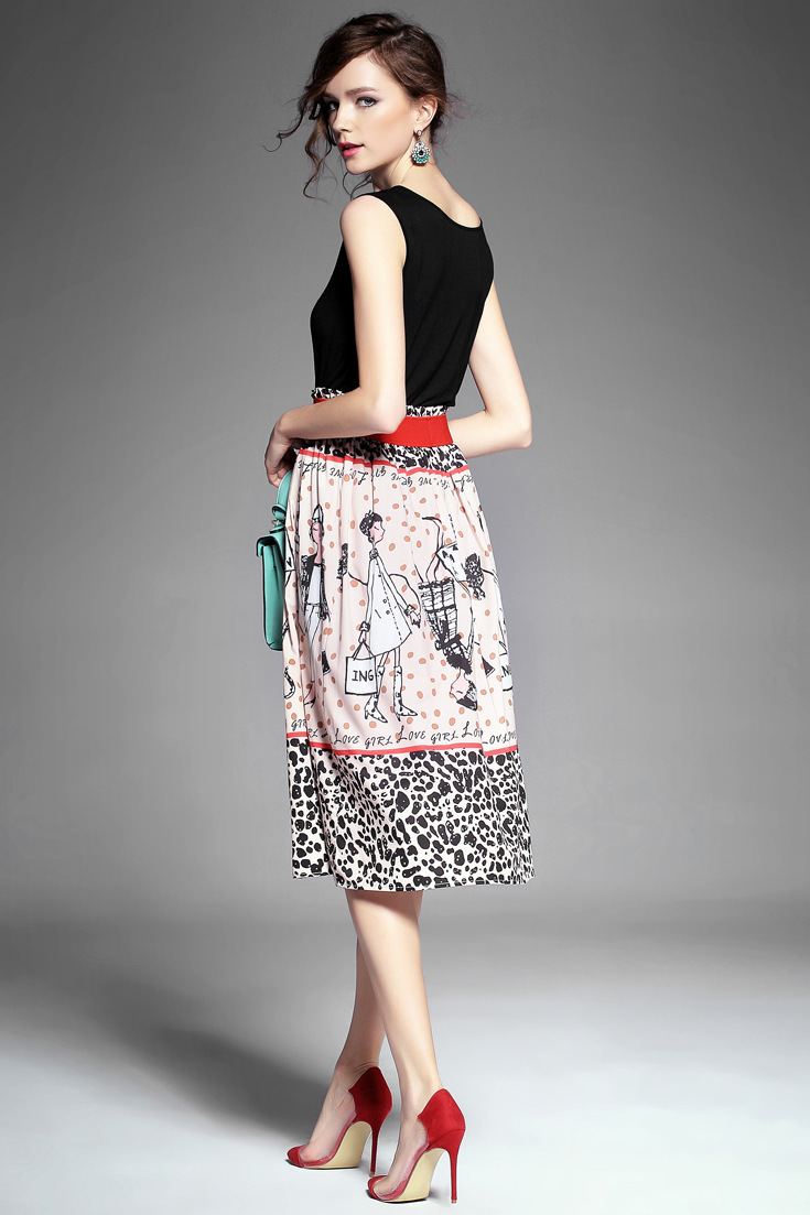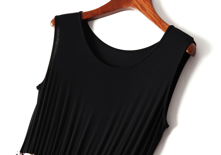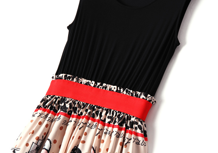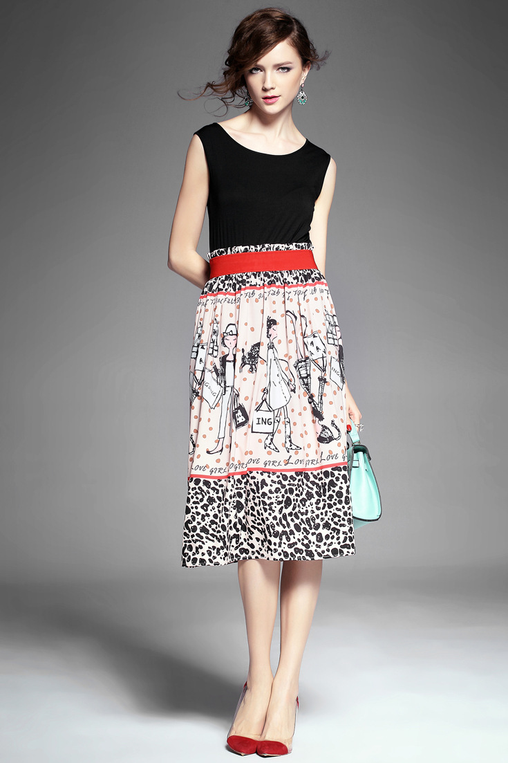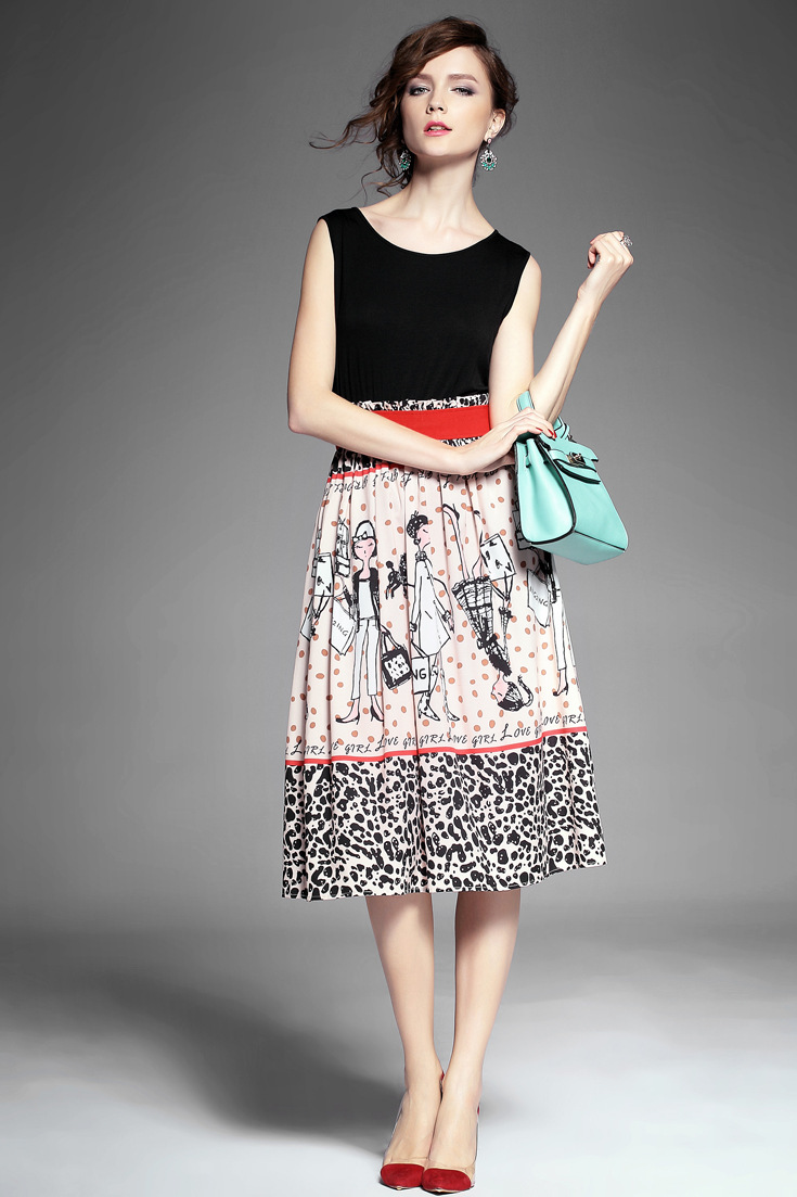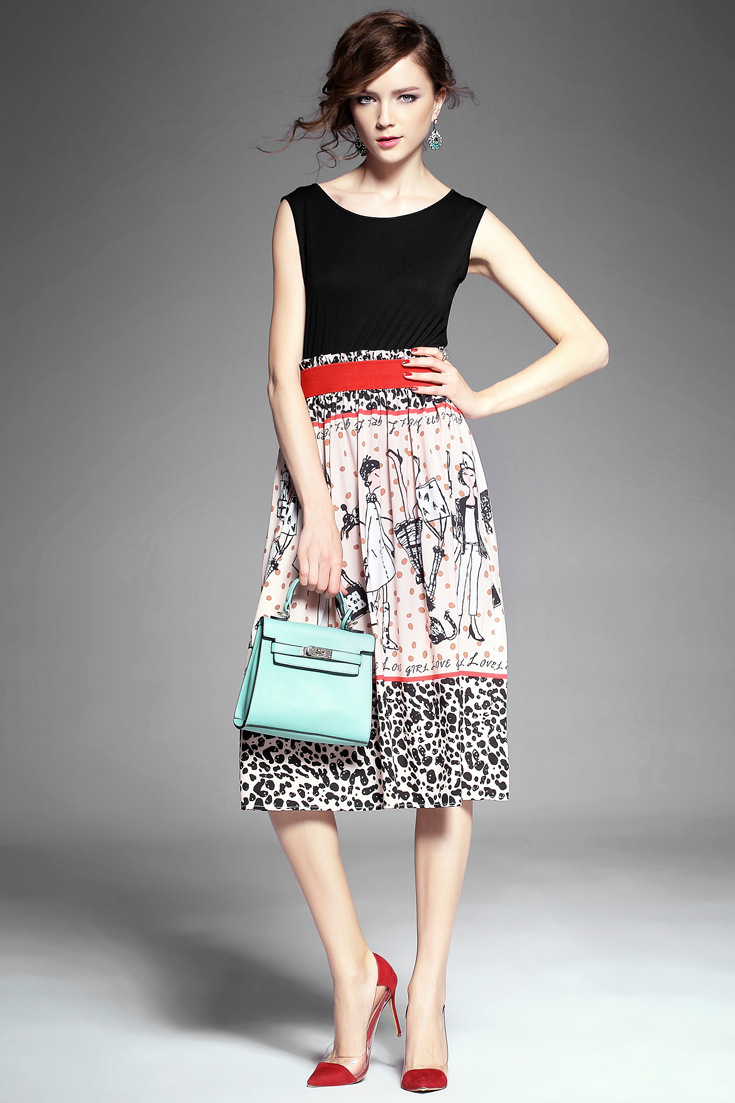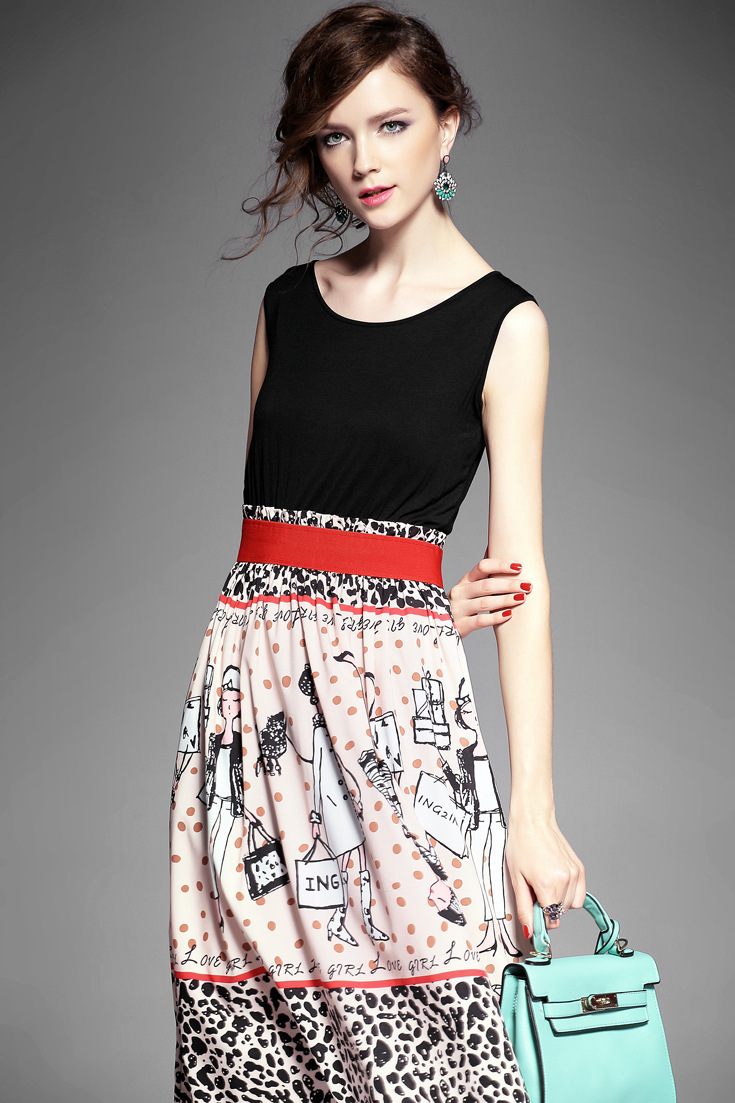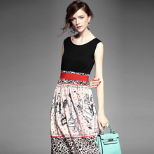 > 2015夏季女装 欧美时尚圆领无袖印花弹力收腰修身大摆中长连衣裙