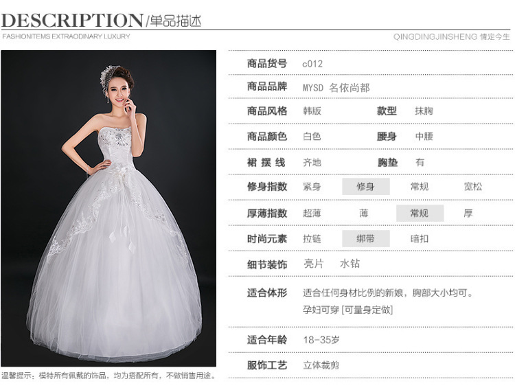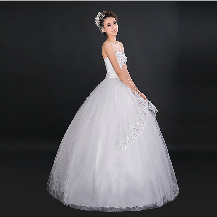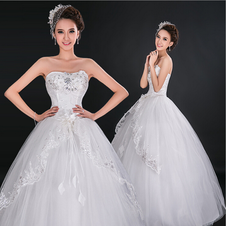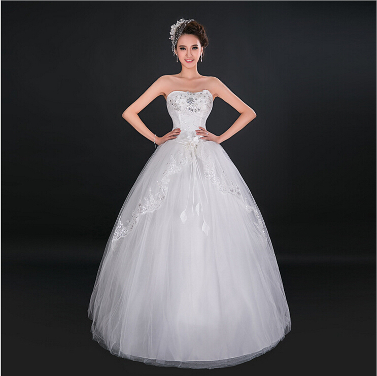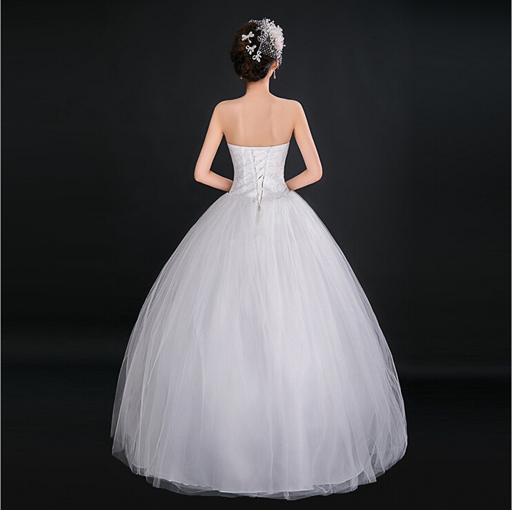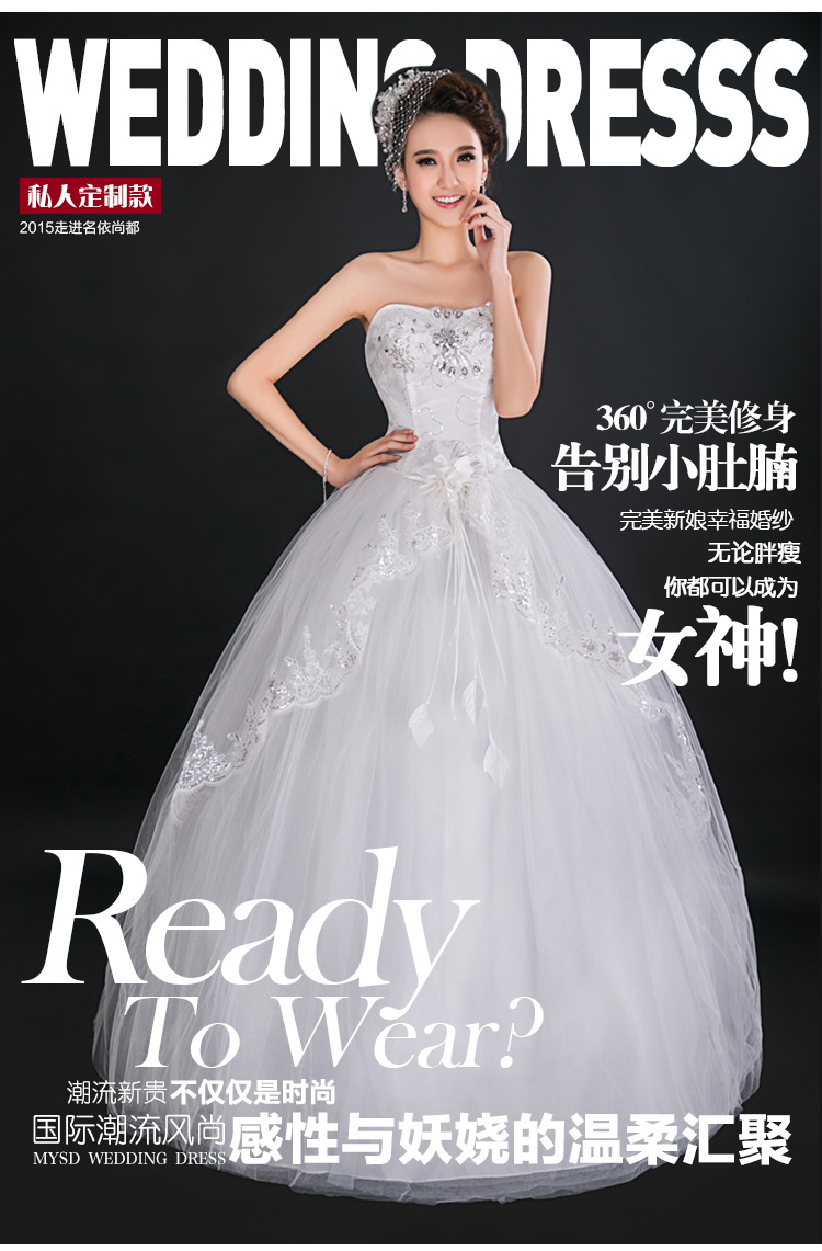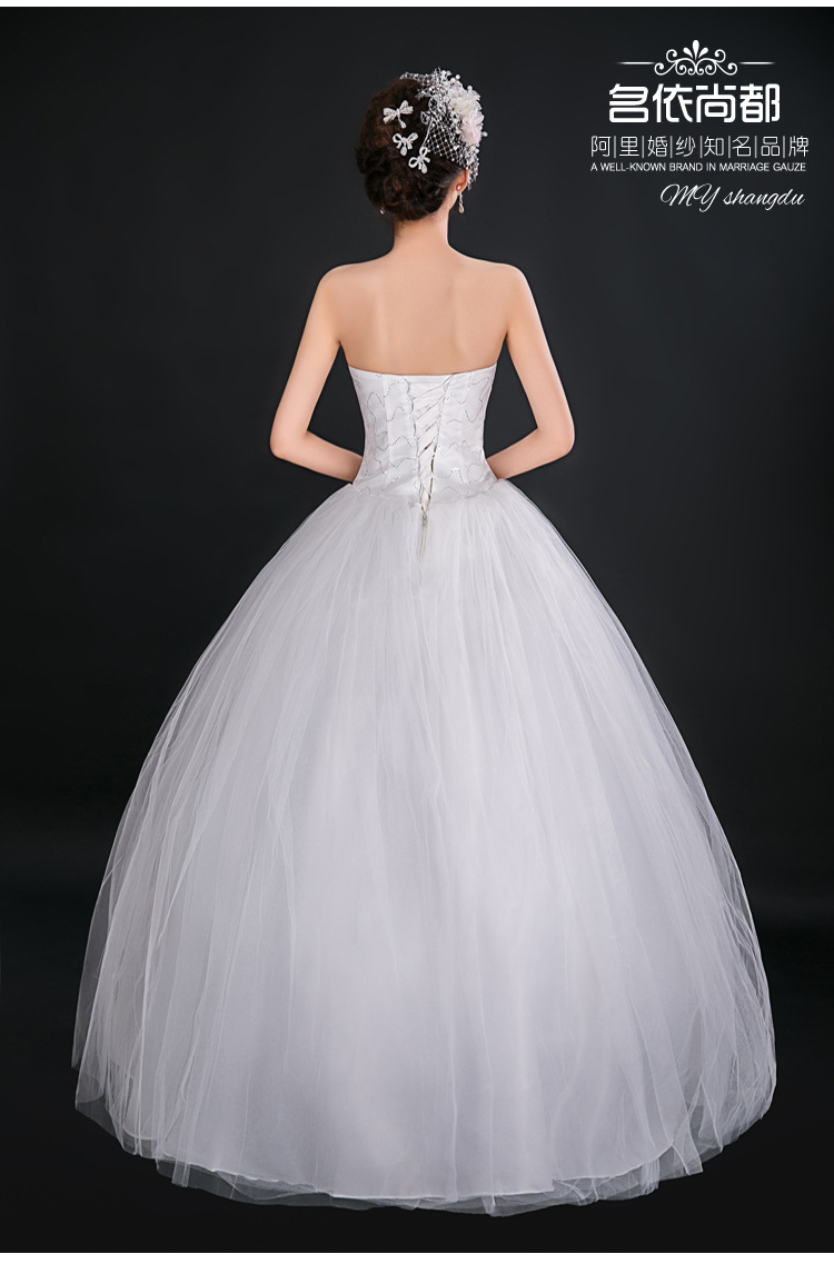 > 高档新娘抹胸齐地外贸婚纱蕾丝花边结婚礼服