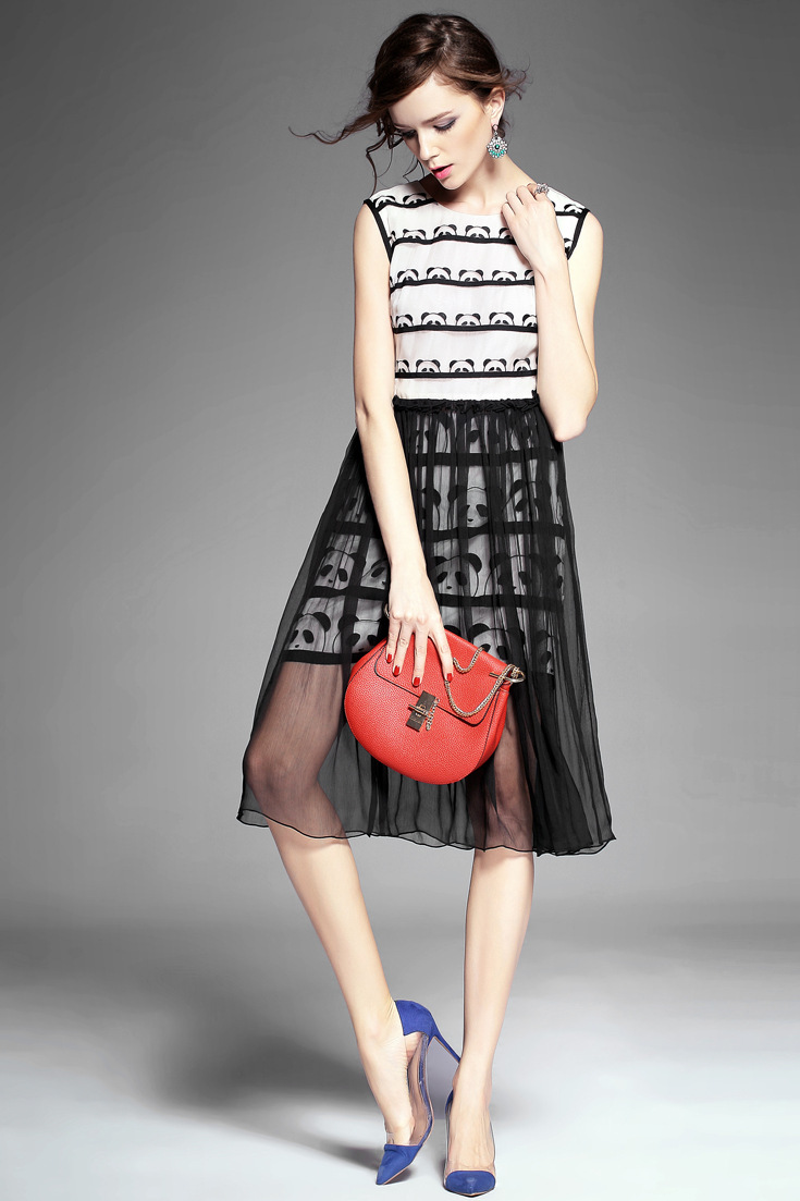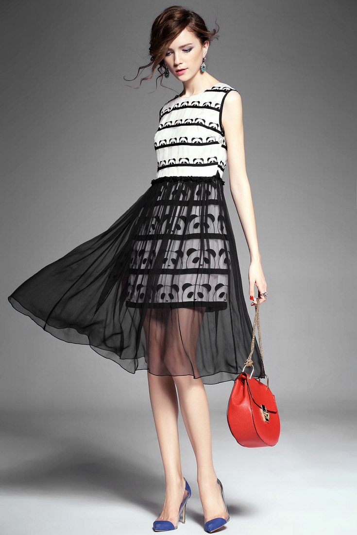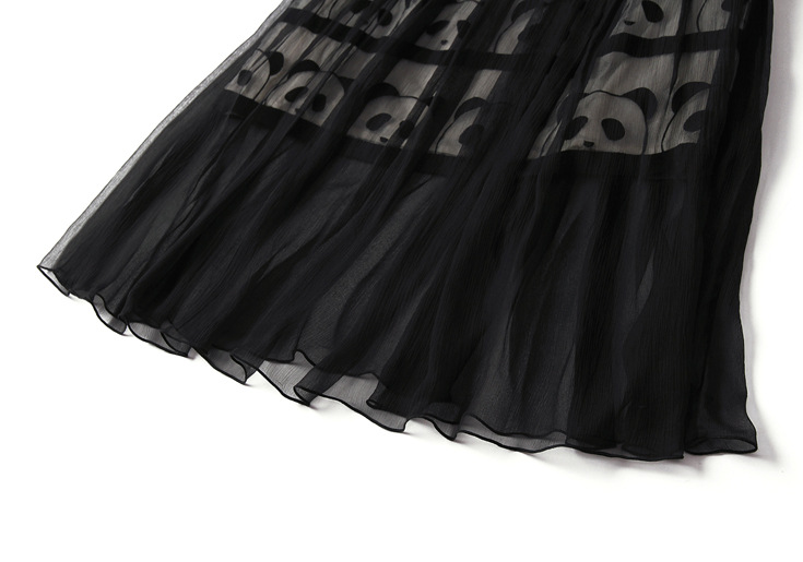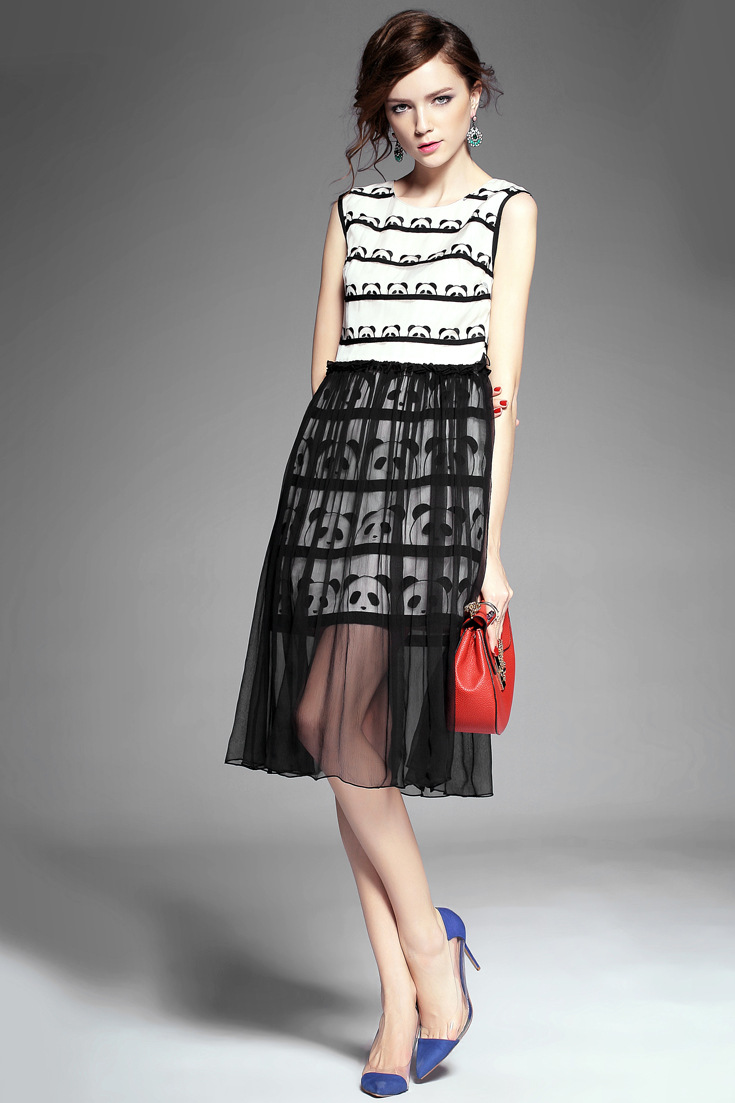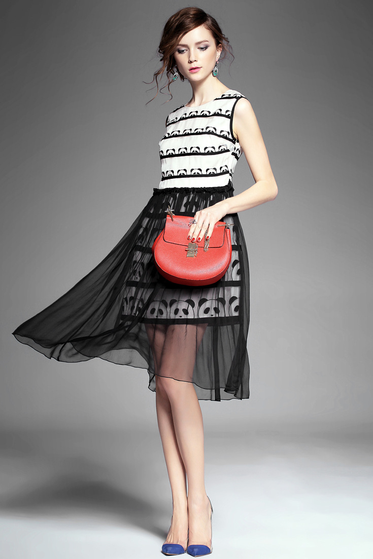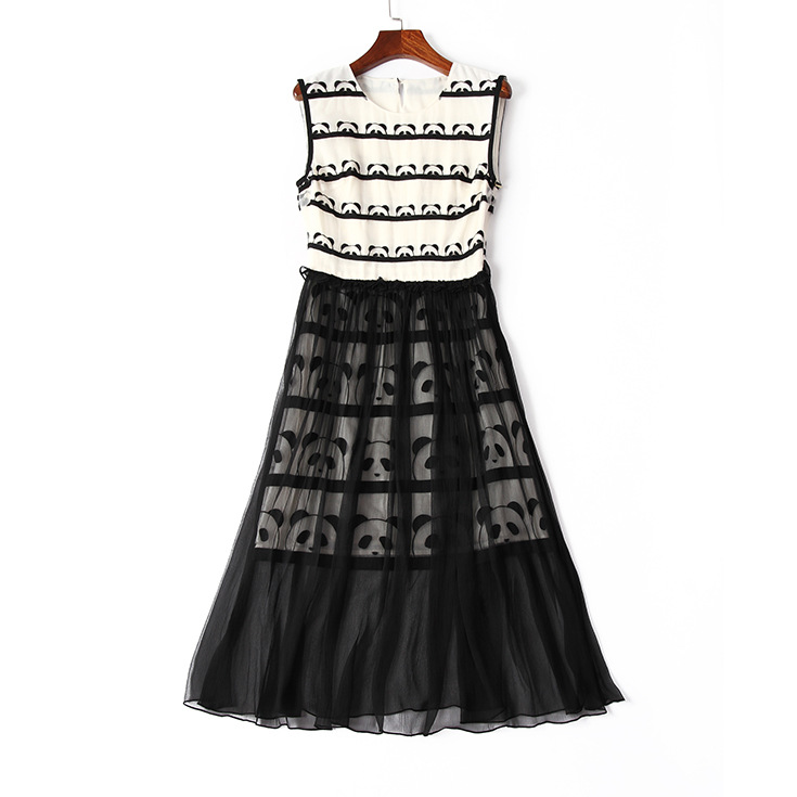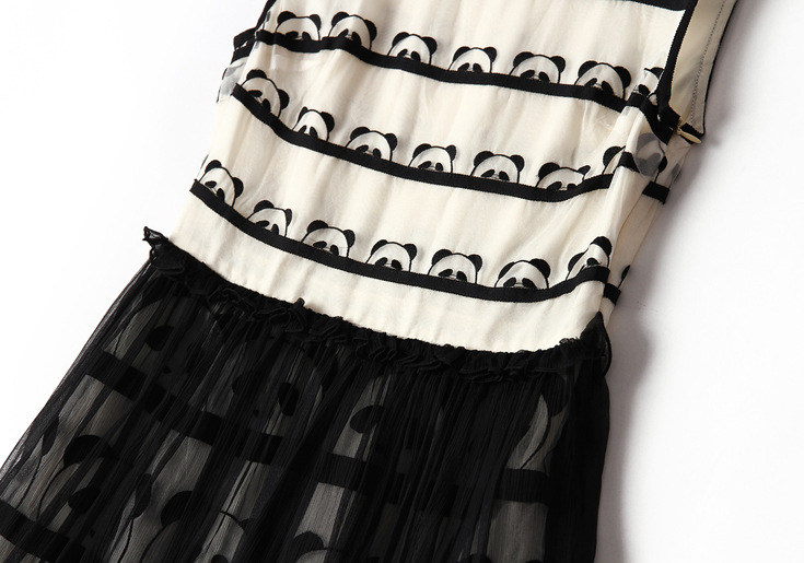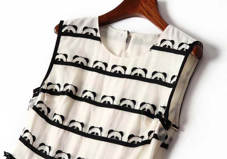 2015欧美品牌夏季女装 重工织带熊猫绣花假两件真丝连衣裙修身