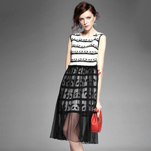 > 2015欧美品牌夏季女装 重工织带熊猫绣花假两件真丝连衣裙修身