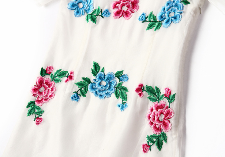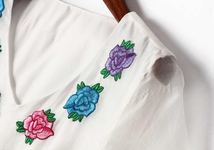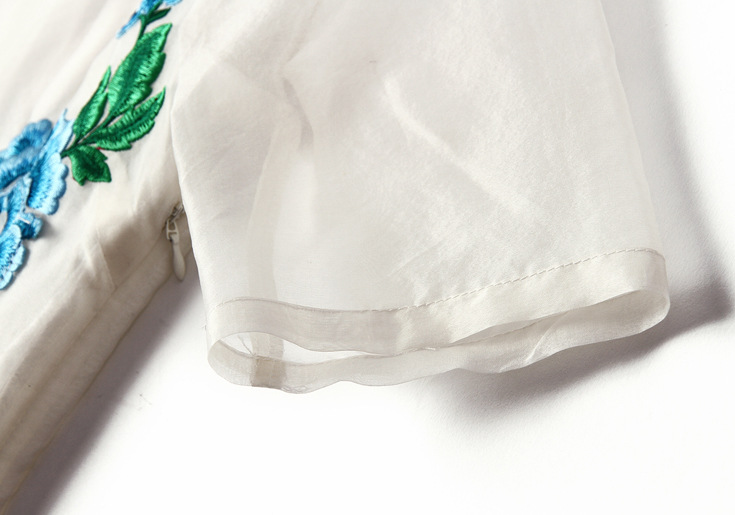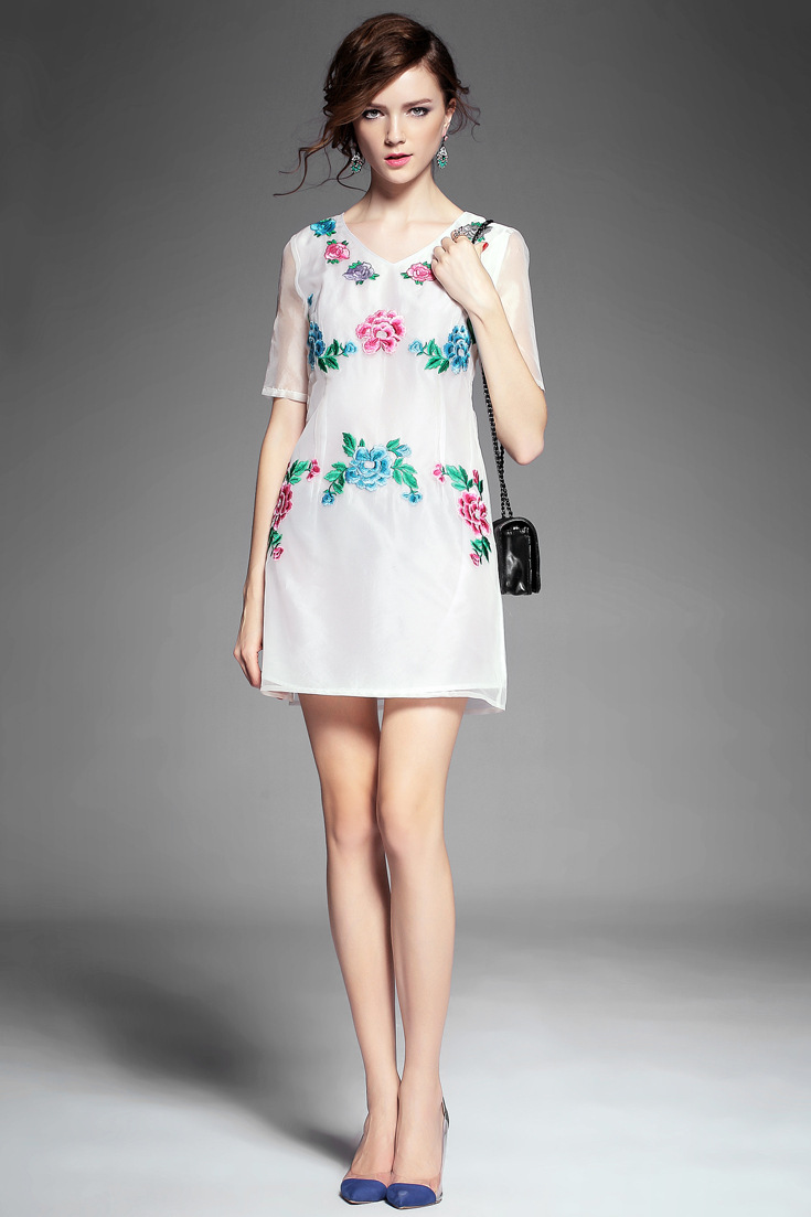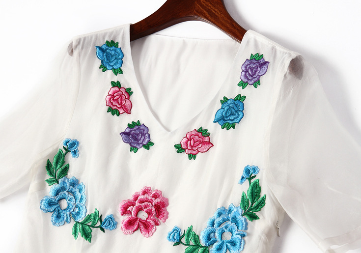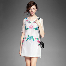 > 2015夏新款 欧美高端v领短袖真丝欧根纱绣花修身一步裙品质连衣裙