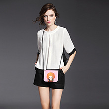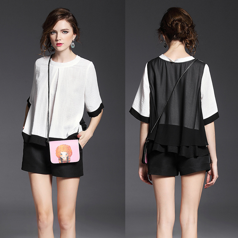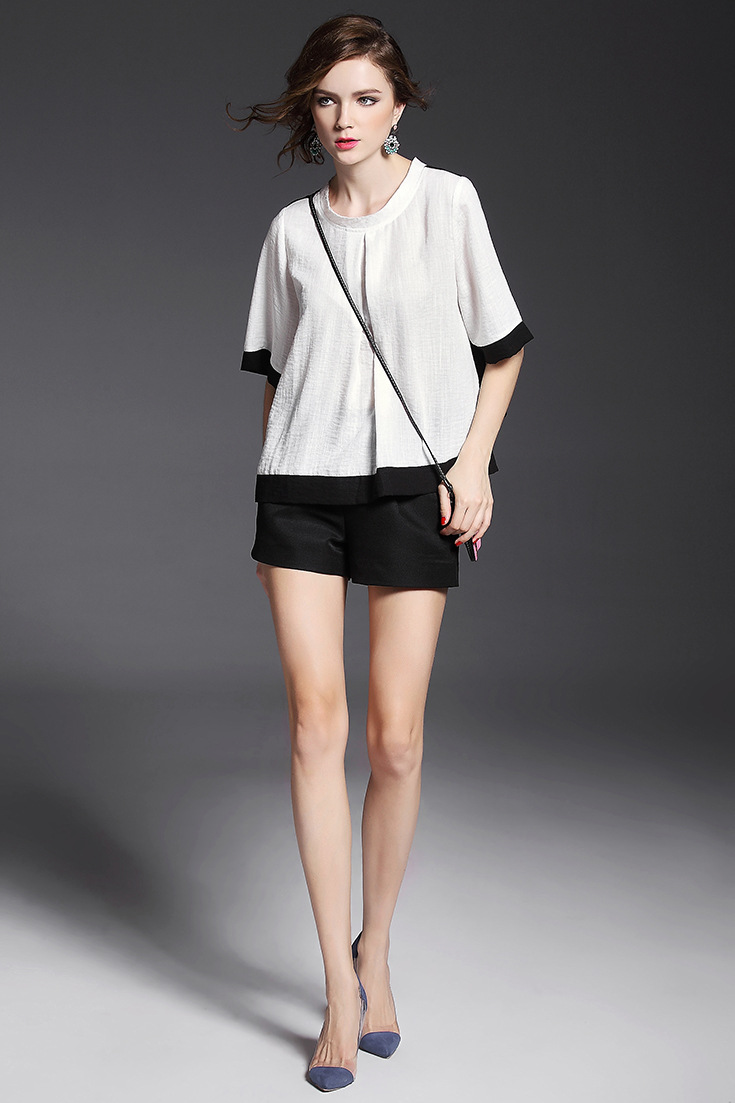 > 2015品牌女装 欧美时尚圆领黑白撞色棉麻上衣+纯色阔腿短裤套装
