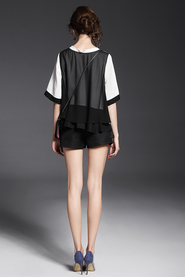 2015品牌女装 欧美时尚圆领黑白撞色棉麻上衣+纯色阔腿短裤套装