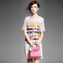 2015夏季新款 欧美高端水溶绣花拼接印花条纹撞色气质修身一步裙