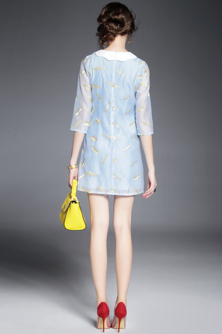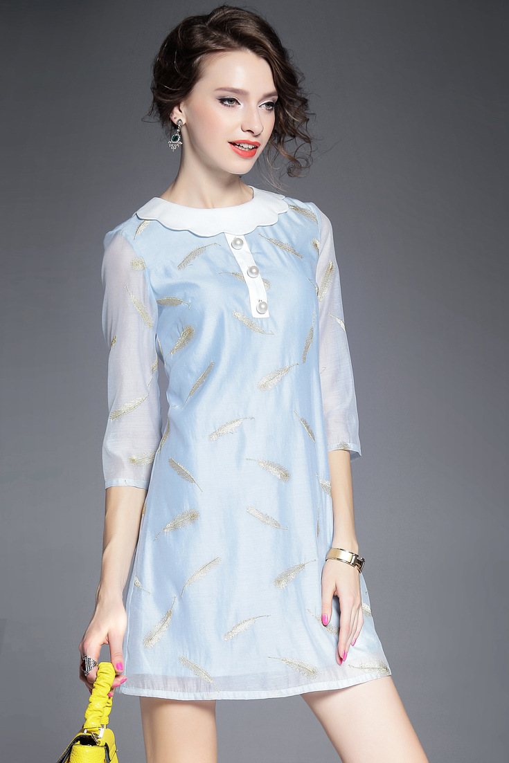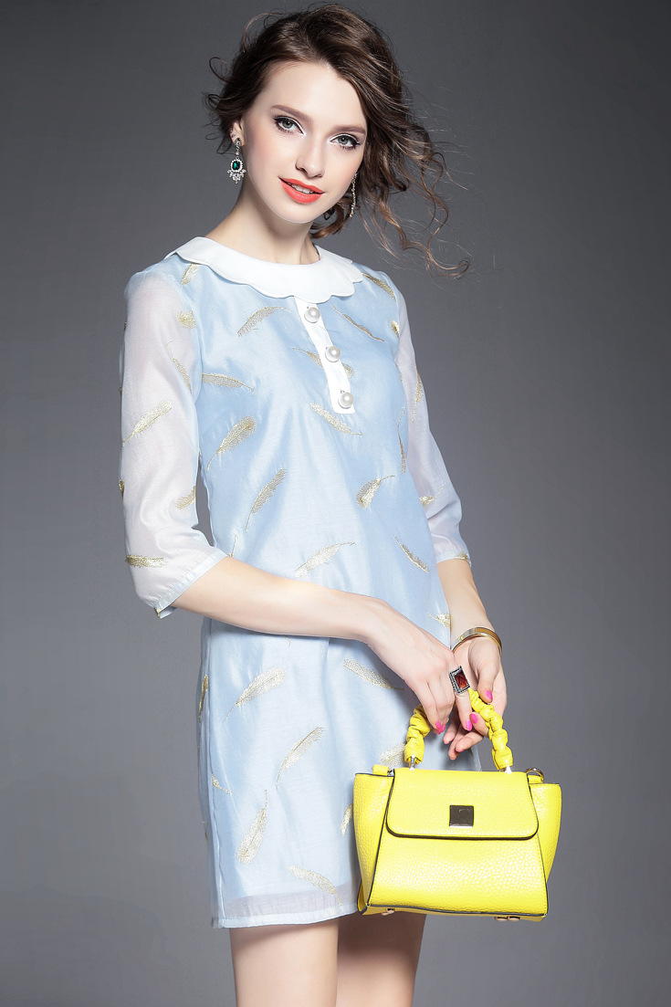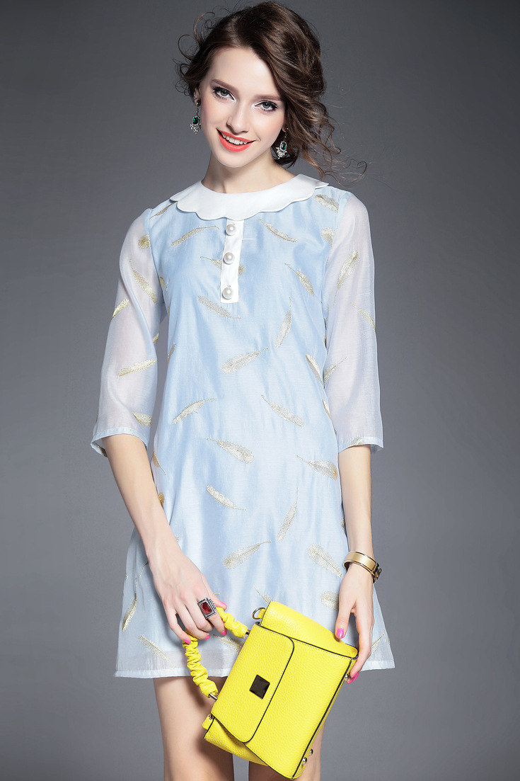 > 2015欧洲站夏季新款女装 气质波浪边领钉珠羽毛绣花修身一步裙