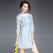 2015欧美风春季仙女裙气质新款刺绣网纱连衣裙七分袖大摆裙