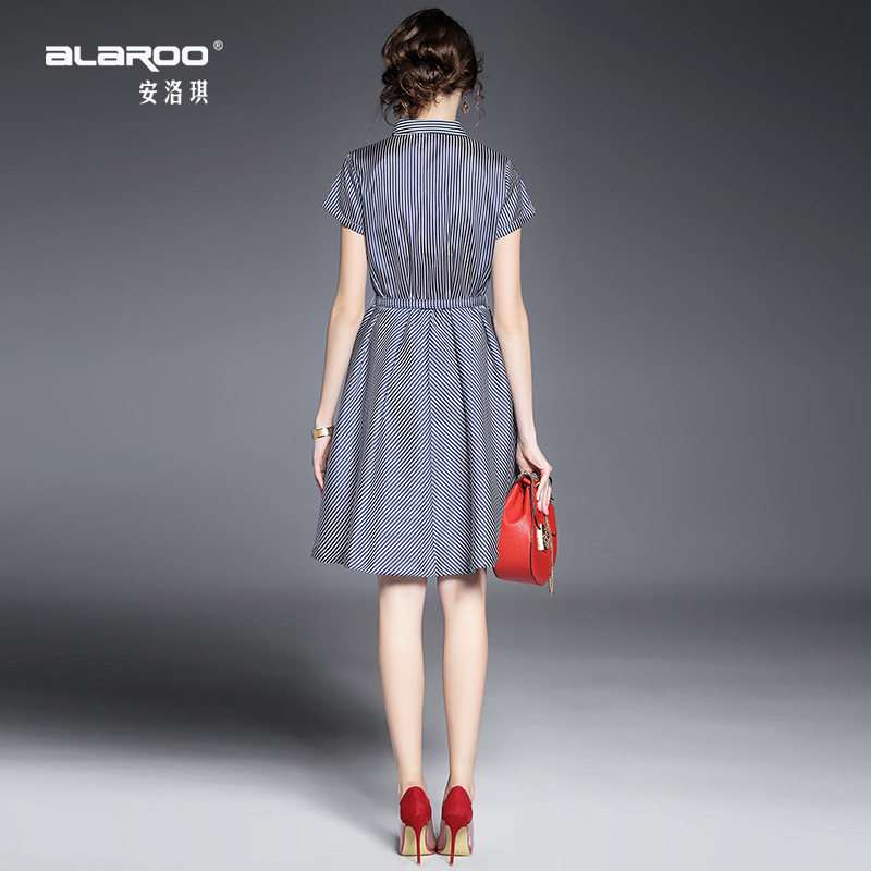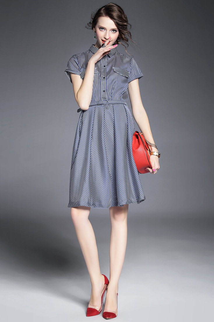 > 2015夏季女装 淑女气质翻领竖条纹假口袋束腰修身大摆a字裙