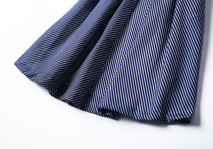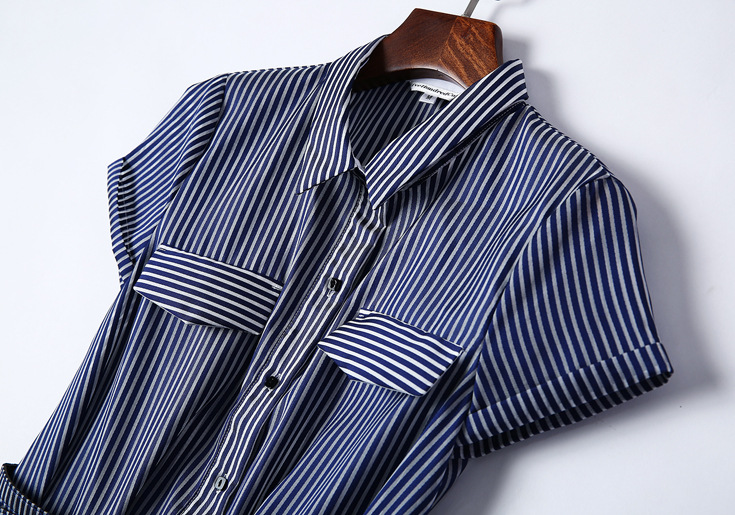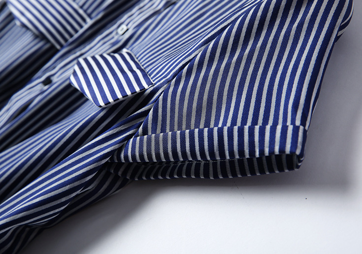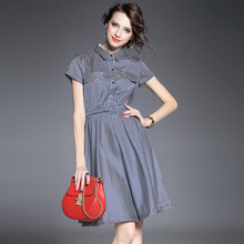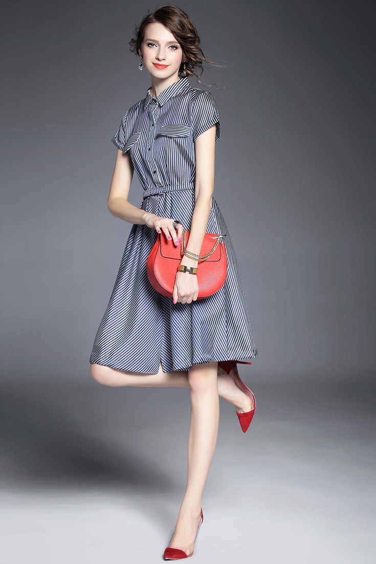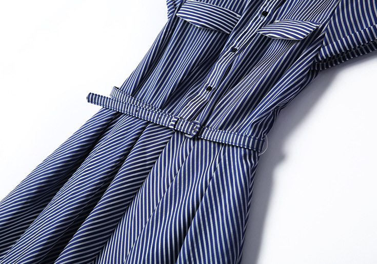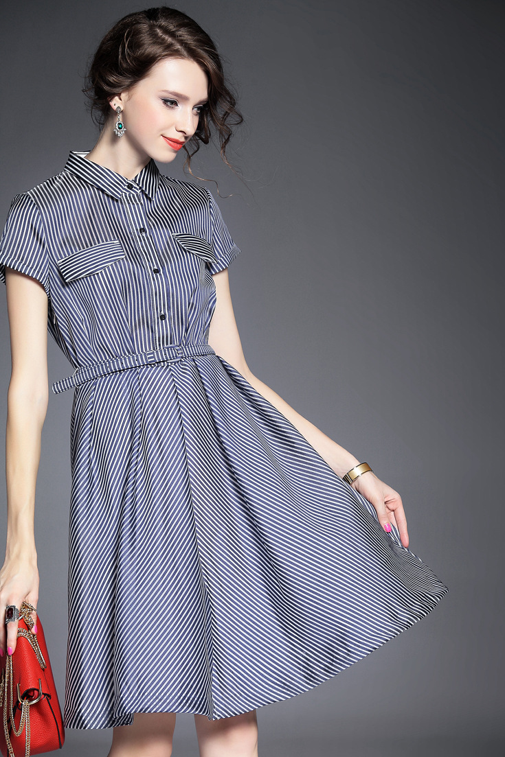 2015夏季女装 淑女气质翻领竖条纹假口袋束腰修身大摆a字裙
