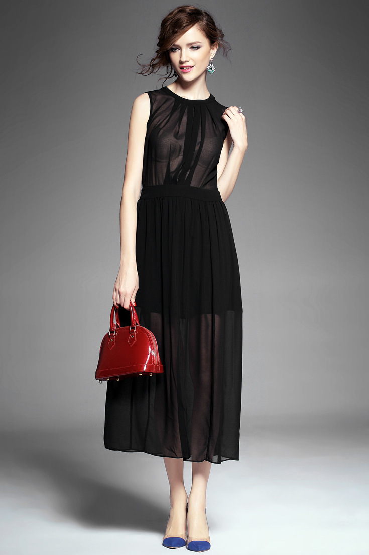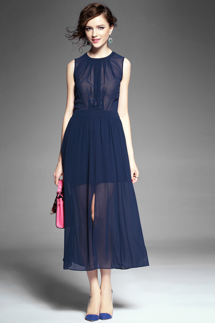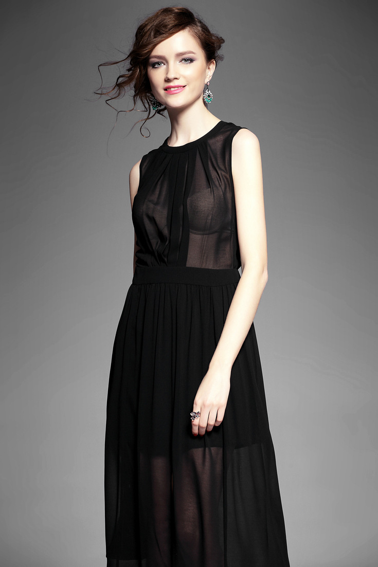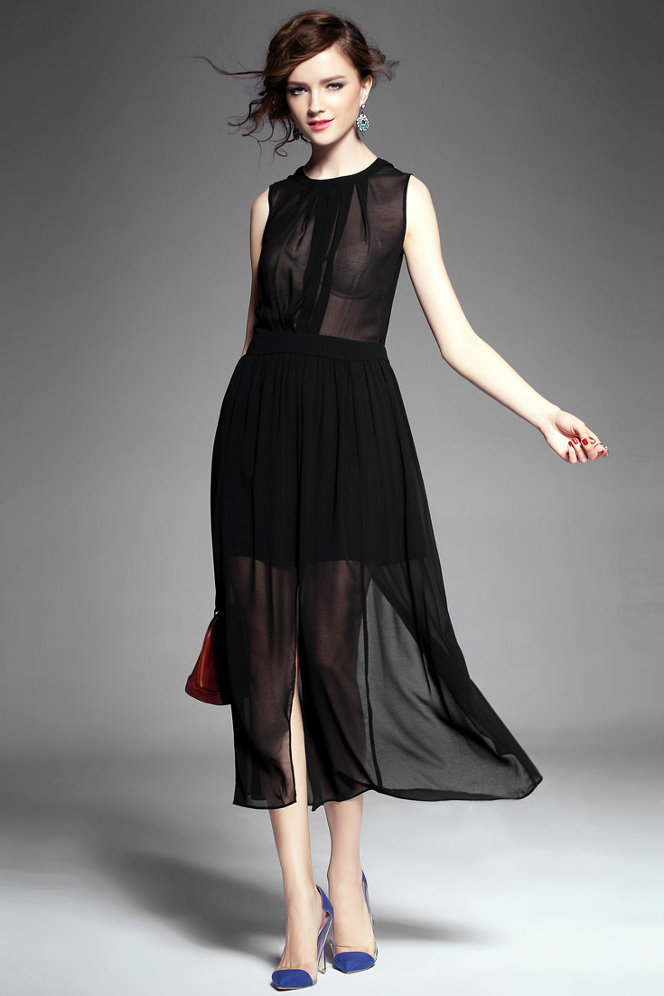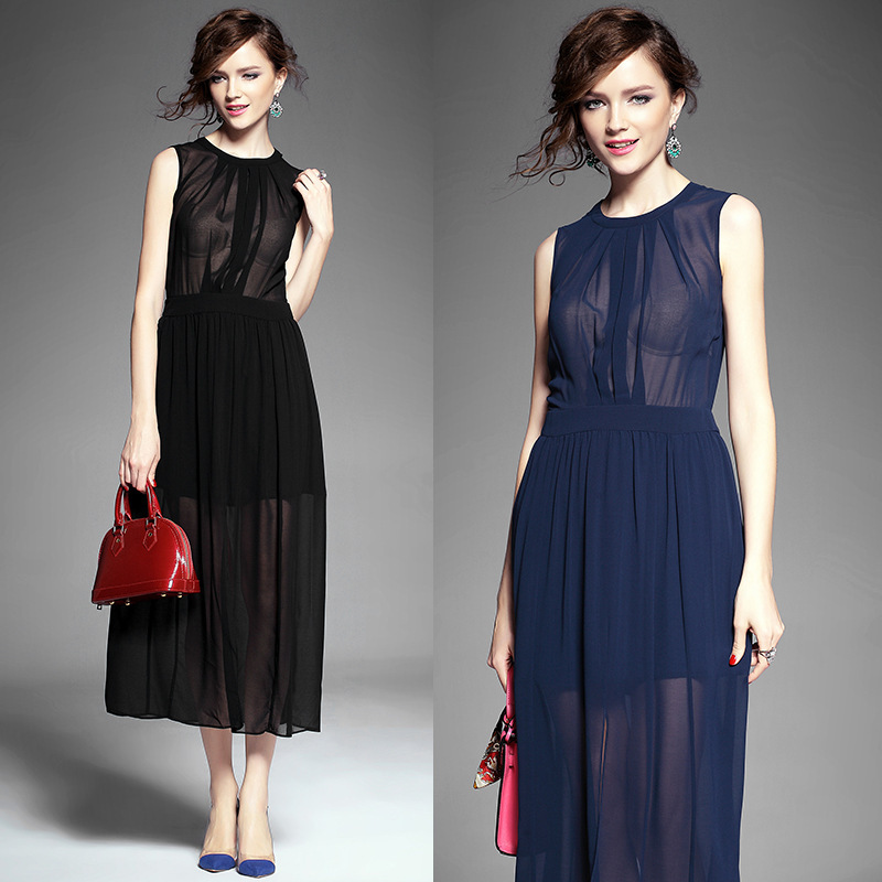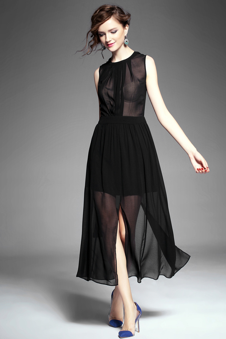 > 2015夏季女装 欧美纯色性感透视露背下摆开叉无袖修身雪纺长裙
