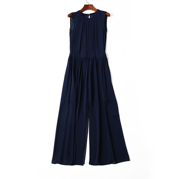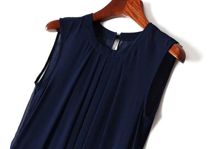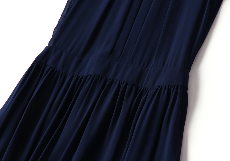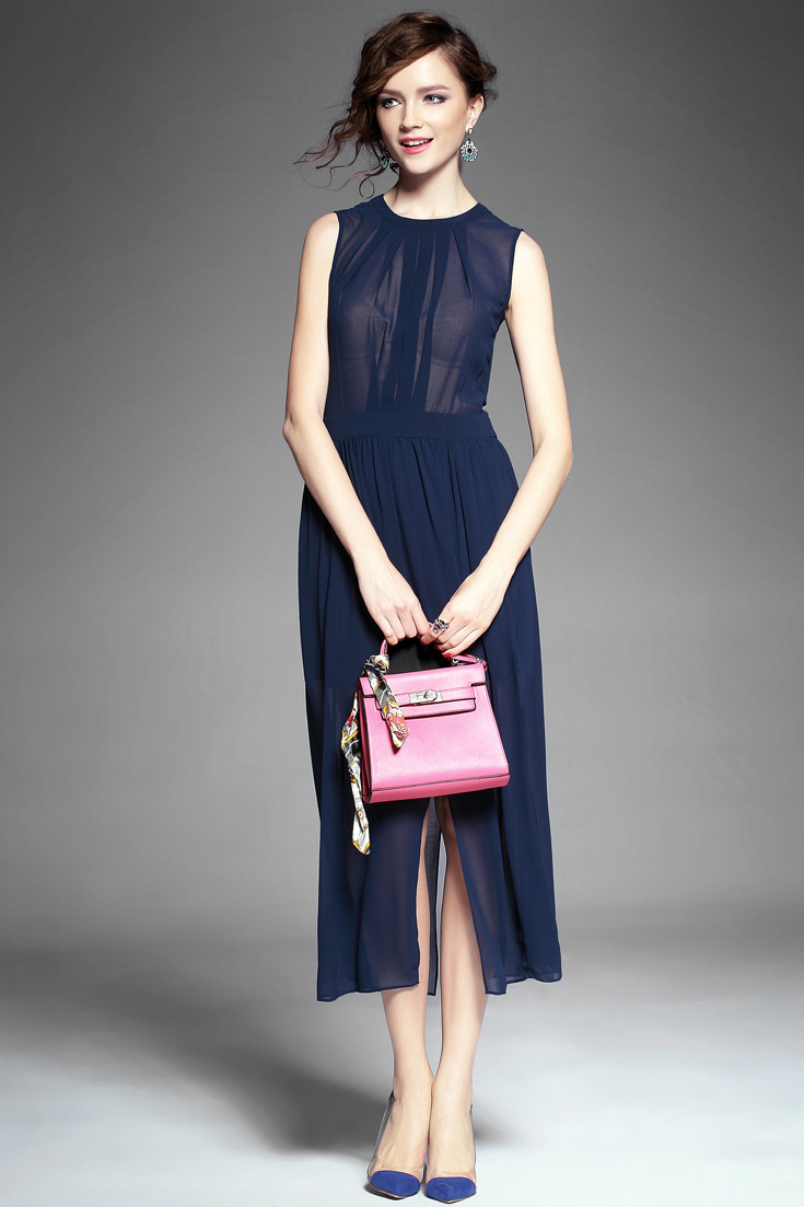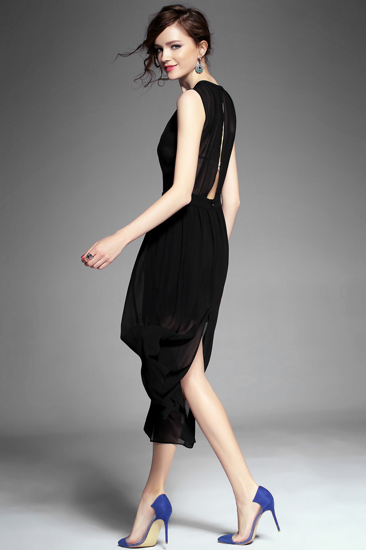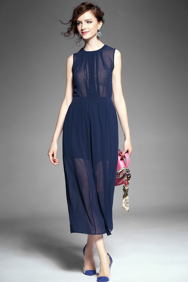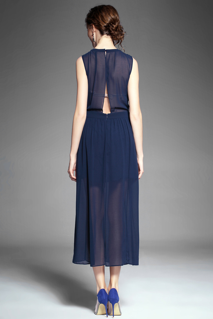 > 2015夏季女装 欧美纯色性感透视露背下摆开叉无袖修身雪纺长裙