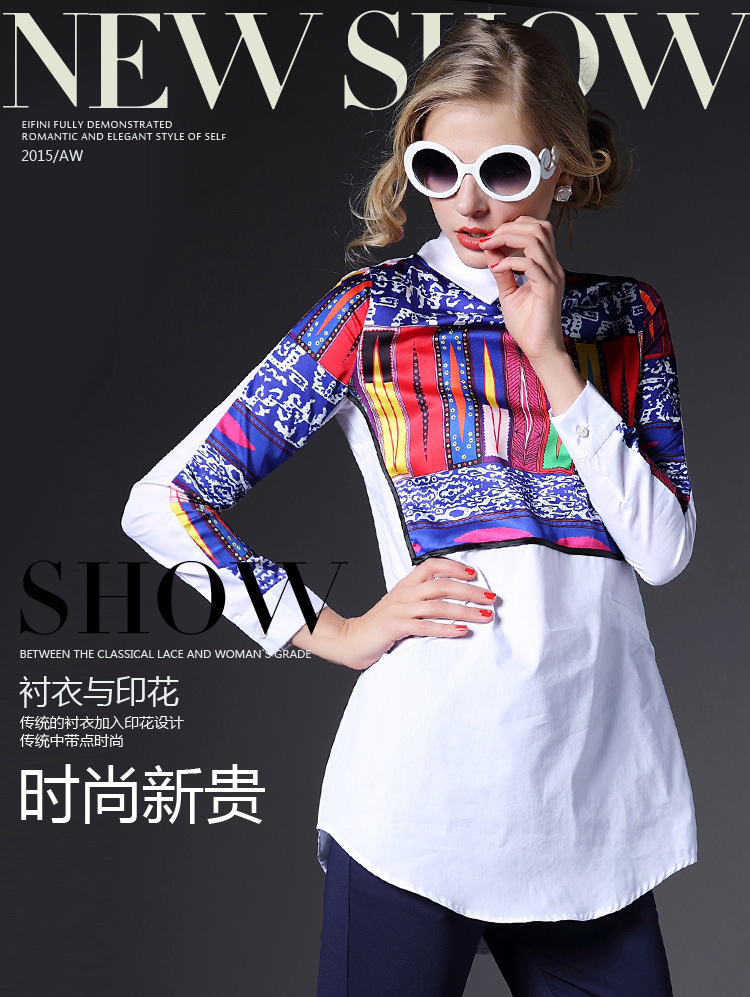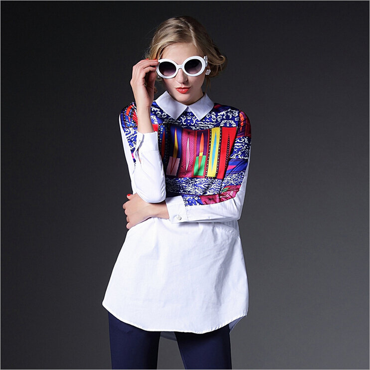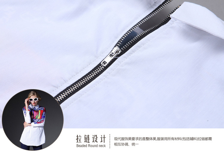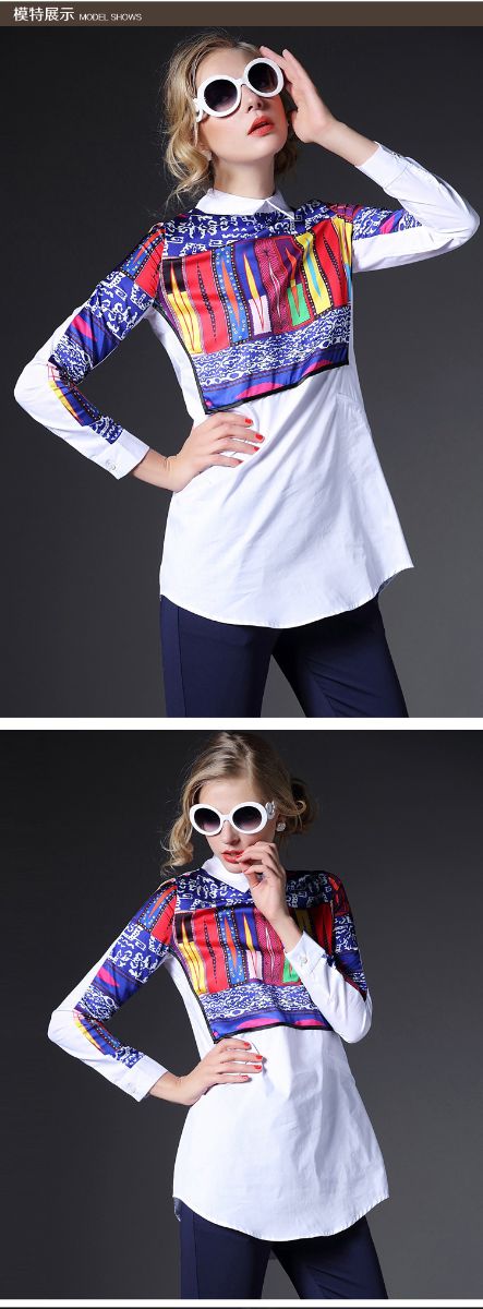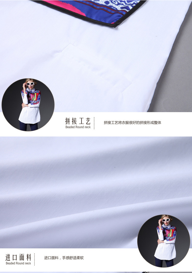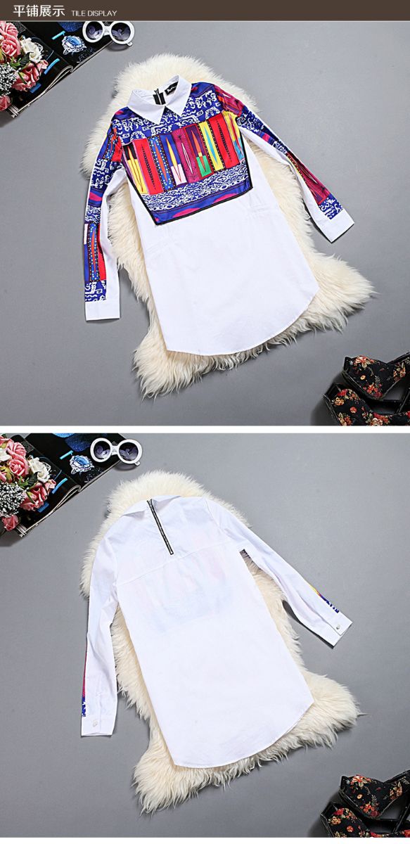 > 2015新款纯棉打底印花白衬衣女中长款宽松全棉长袖白色衬衫
