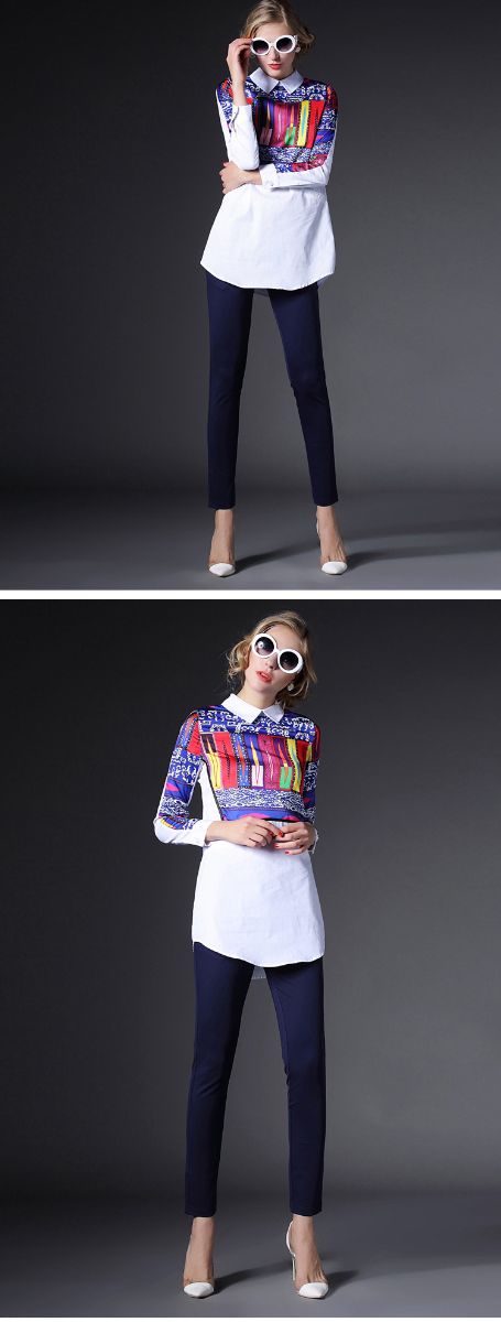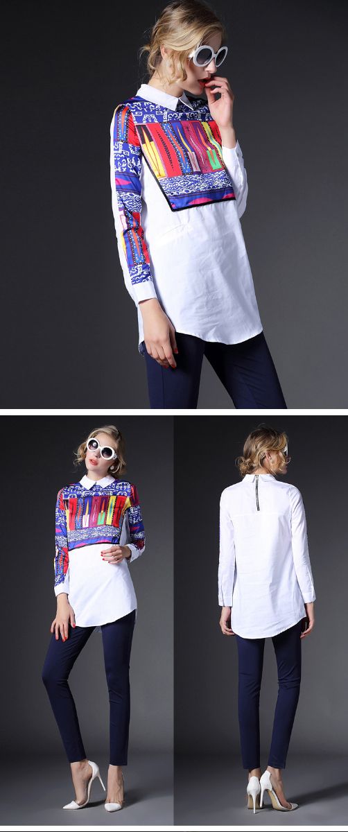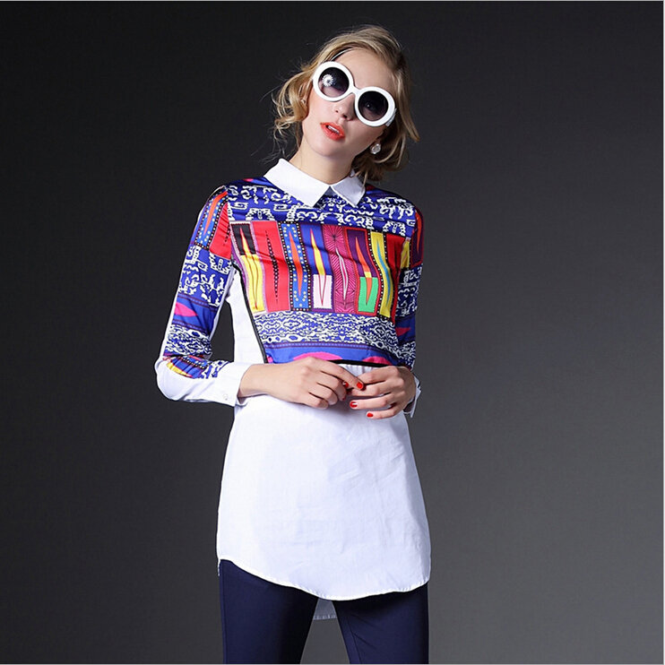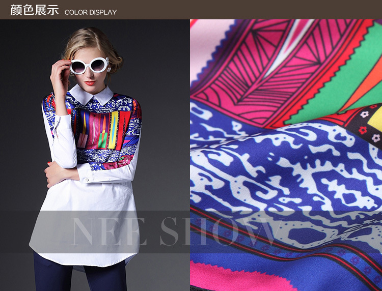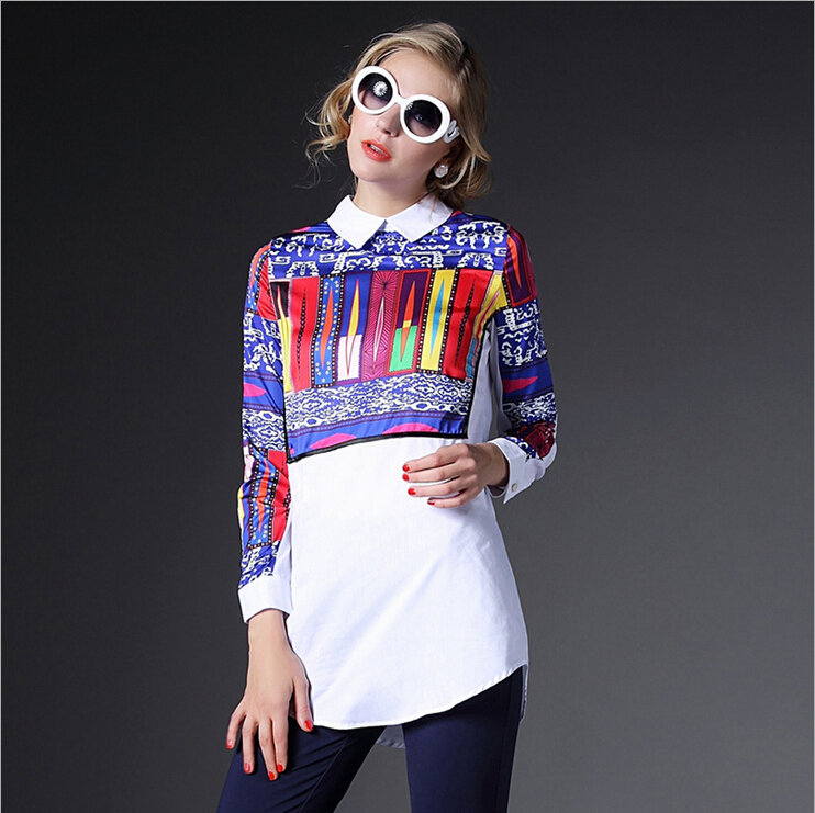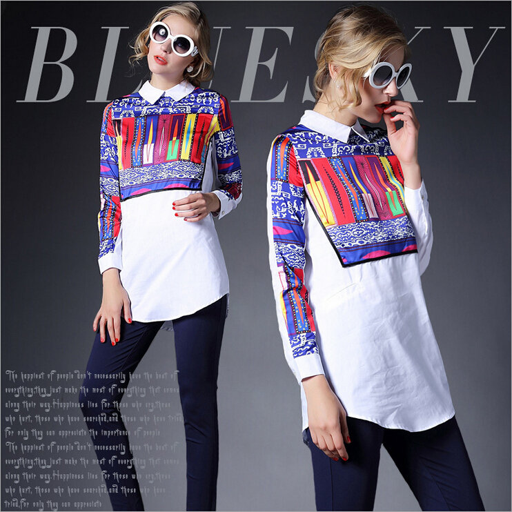> 2015新款纯棉打底印花白衬衣女中长款宽松全棉长袖白色衬衫
