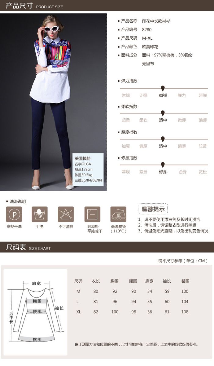2015新款纯棉打底印花白衬衣女中长款宽松全棉长袖白色衬衫
