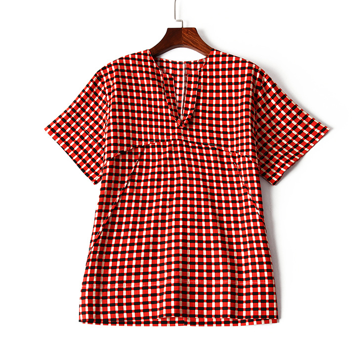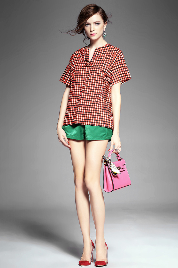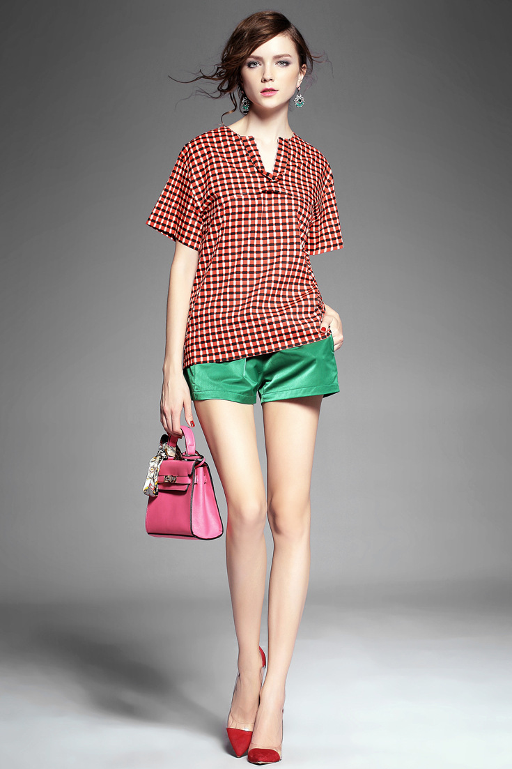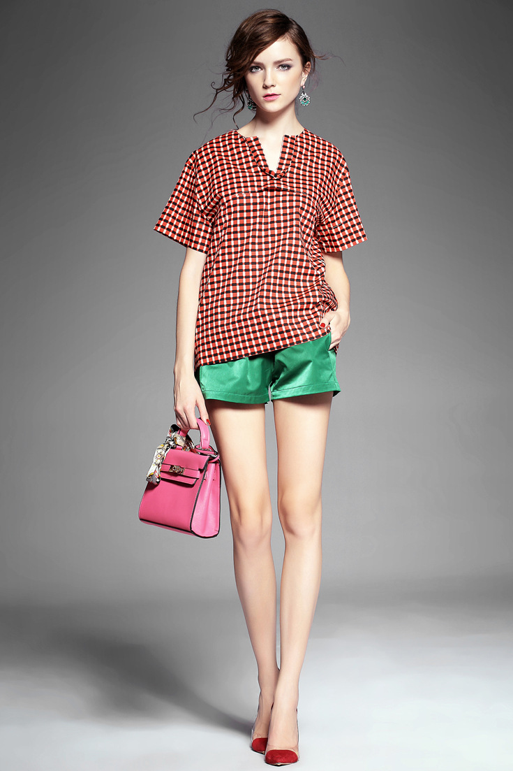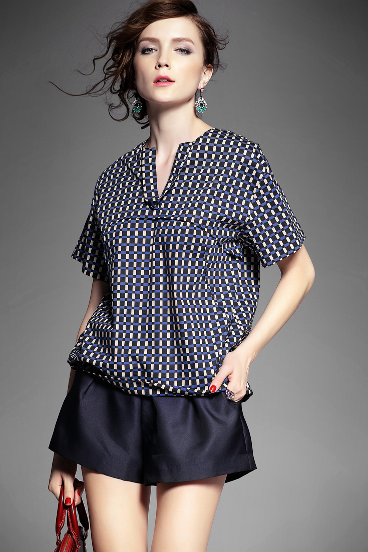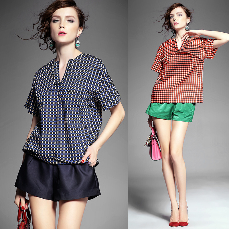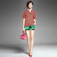 > 2015夏季女装新款 韩版小v领气质拼接套头格纹宽松上衣纯棉衬衣