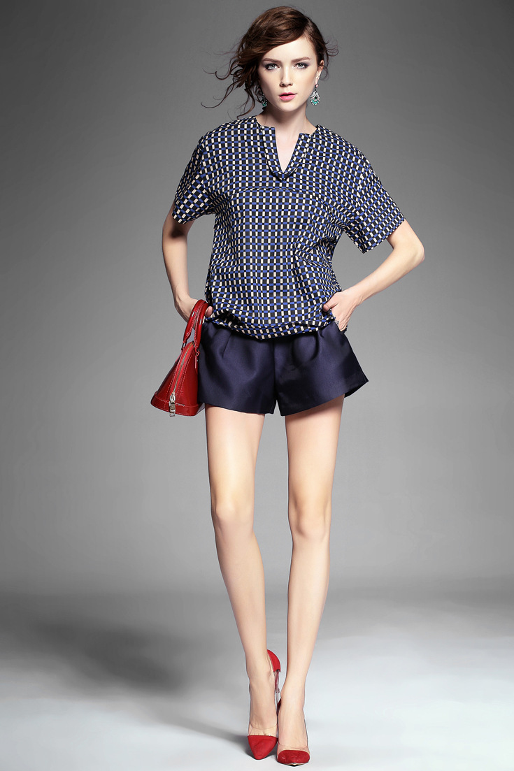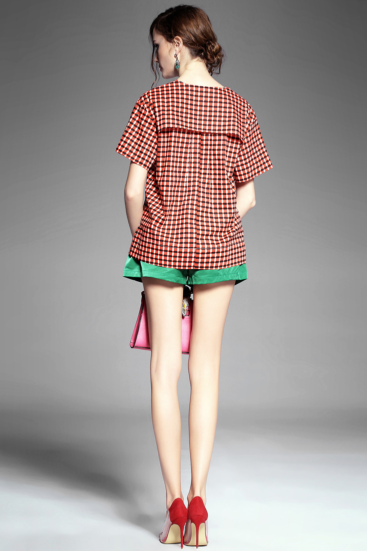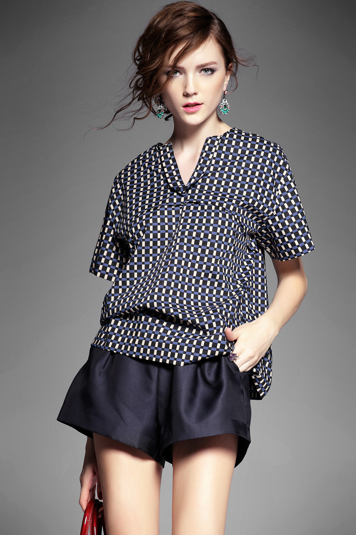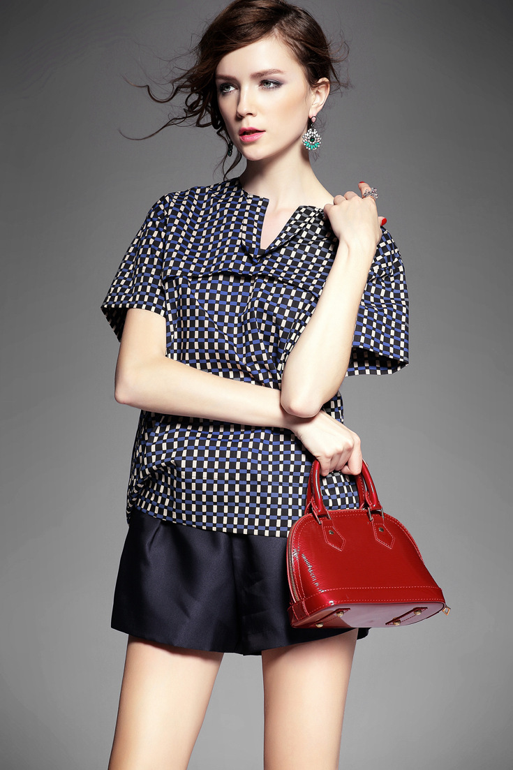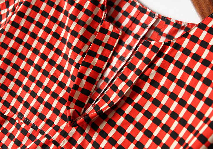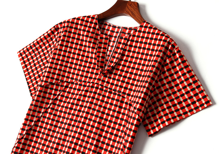 > 2015夏季女装新款 韩版小v领气质拼接套头格纹宽松上衣纯棉衬衣