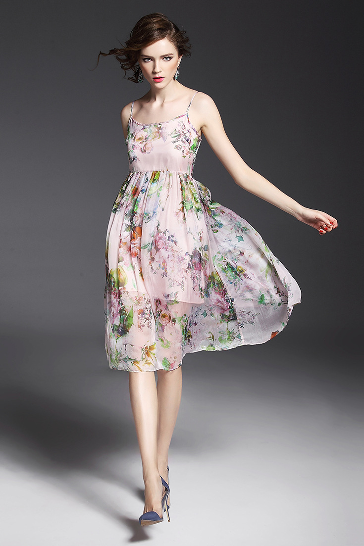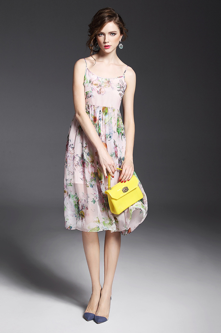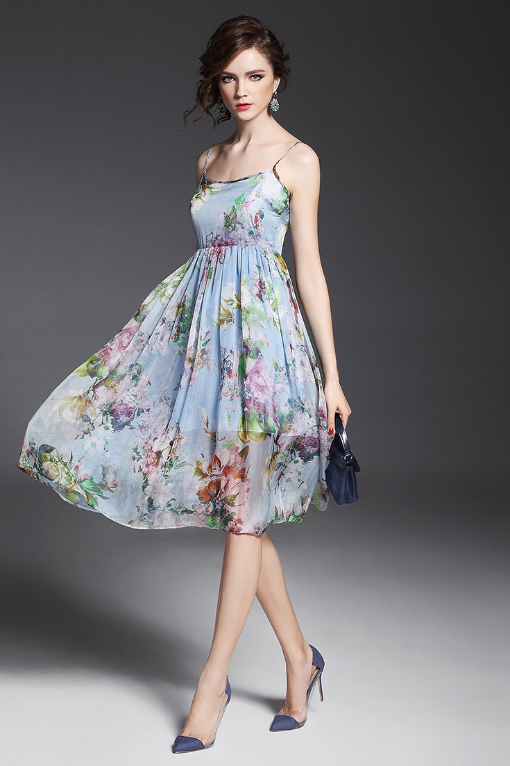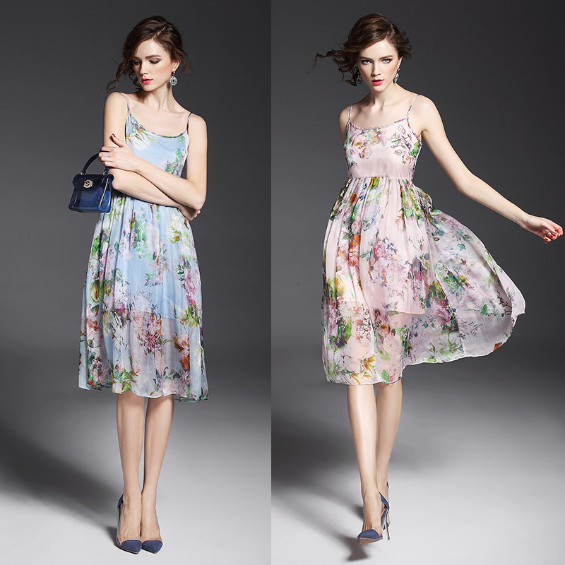 > 2015夏季女装 欧美气质印花高腰修身大摆中长裙真丝吊带连衣裙