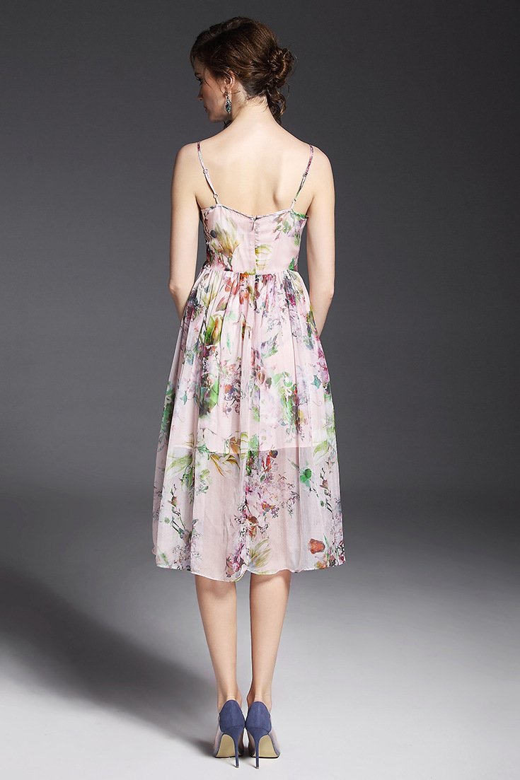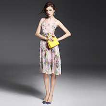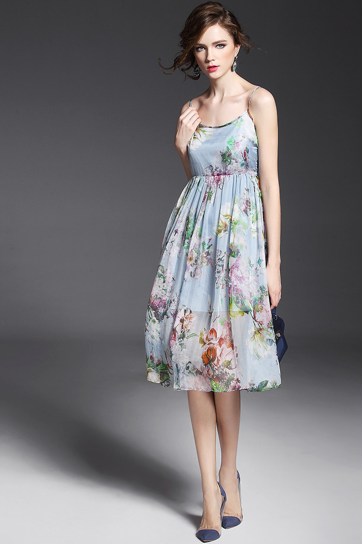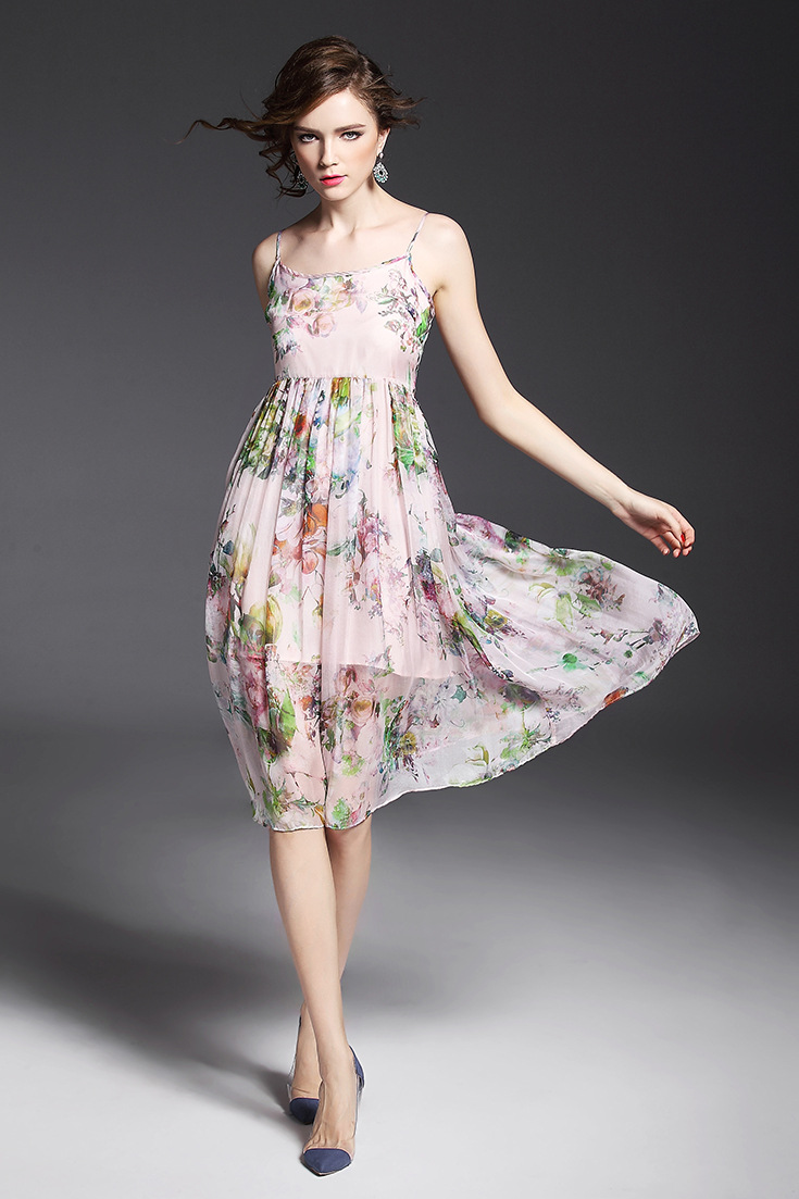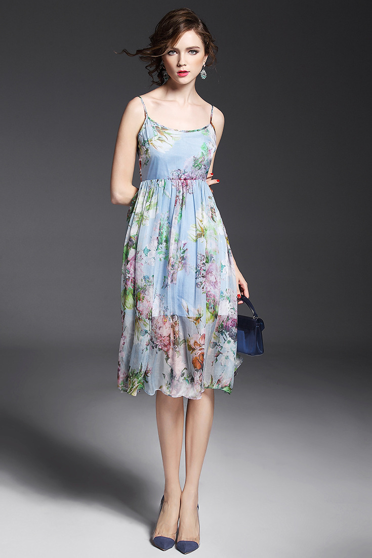 > 2015夏季女装 欧美气质印花高腰修身大摆中长裙真丝吊带连衣裙