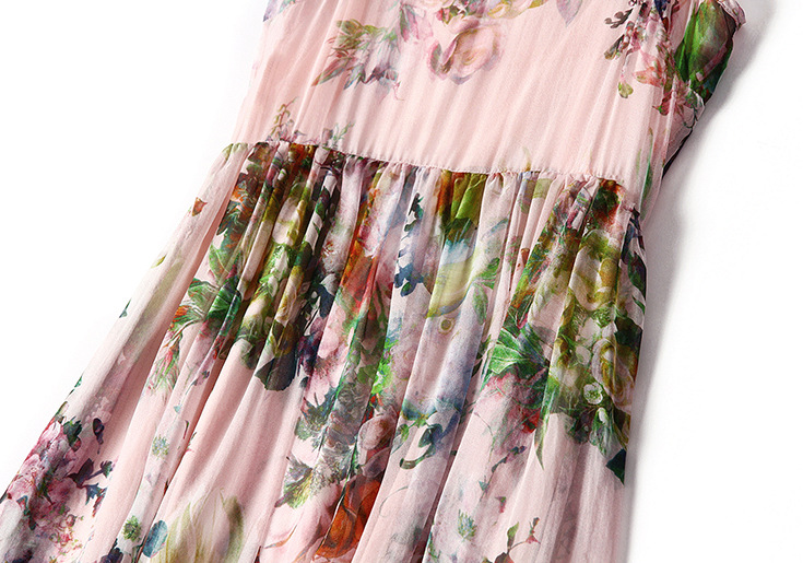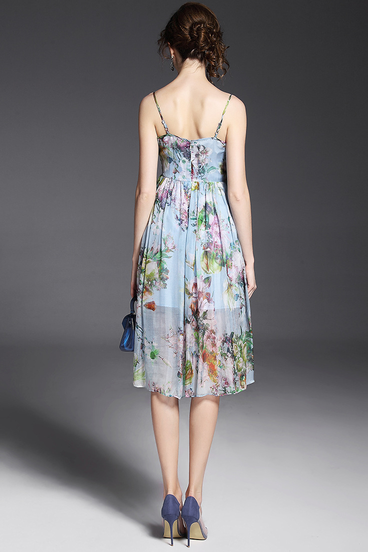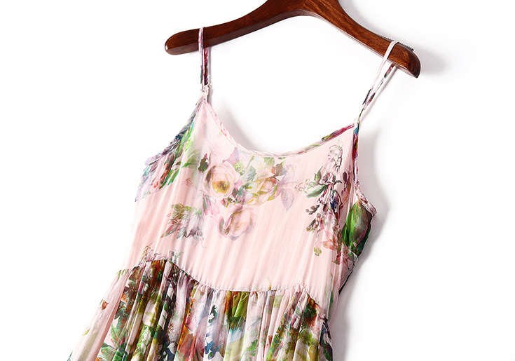 2015夏季女装 欧美气质印花高腰修身大摆中长裙真丝吊带连衣裙