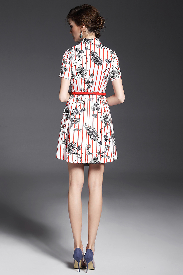2015夏季品质女装批发 英伦翻领竖条纹印花收腰修身连衣裙送腰带