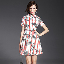 > 2015夏季品质女装批发 英伦翻领竖条纹印花收腰修身连衣裙送腰带