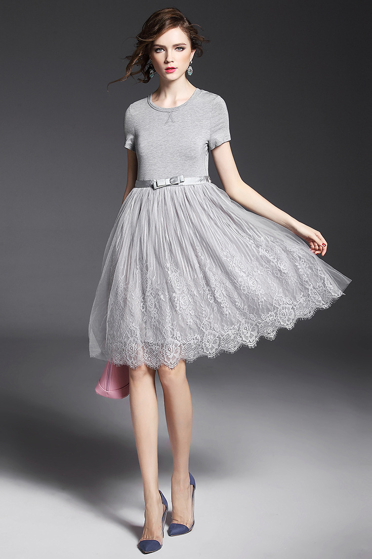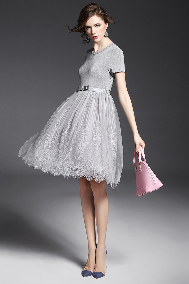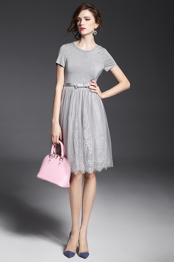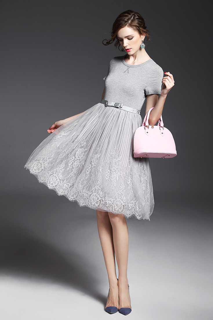 > 2015夏季女装 优雅气质弹力针织蝴蝶结蕾丝拼接网纱裙摆修身a字裙