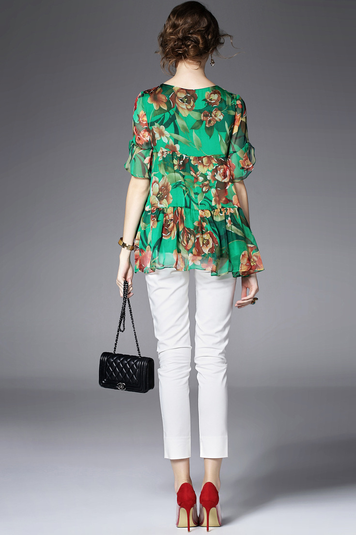 2015夏季女装新款 欧美高端圆领包肩袖玫瑰花亚麻女T恤印花小上衣